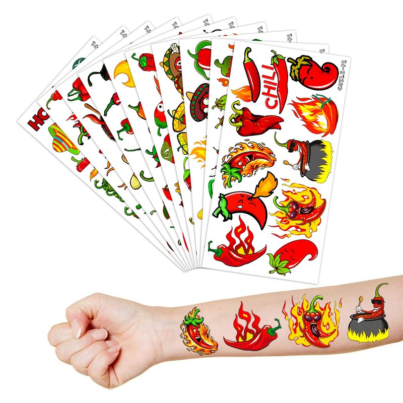- 🔥CHILI PARTY FAVORS: Add some spice to your party with these Chili temporary tattoos! Choose from a variety of incredible designs, with many CHILI images, such as images of hot peppers, Chili cook up,... Get yours now to make your event even more exciting!