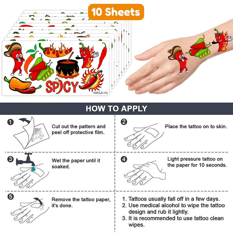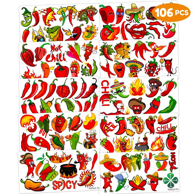 - 🌶️CHILI PARTY DECORATIONS: Hi everyone! An amazing set of 10 sheets including 106 a size of 6.1 by 3.1 inches. These CHILI tattoo pieces will be sent to you quickly, place your order to get these temporary tattoos.