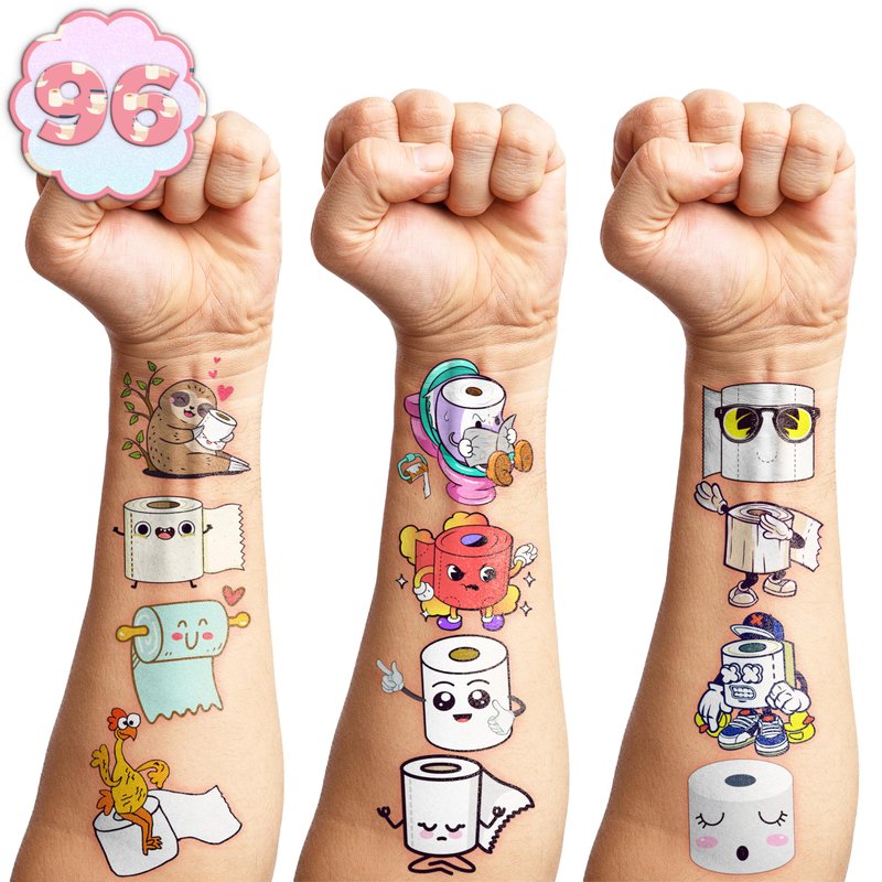 🧻 PERFECT TATTOOS FOR TOILET PAPER THEMED DECORATION: TOILET PAPER for people who love FUNNY, CUTE,. Featuring 10 sheets with 106 pcs of lovely, fun and colorful design. Each sheet measures 6.1 * 3.1 inches. You can temporarily tattoo them on your body or objects such as phones, bottles, laptop… 🧻 FUN GIFT IDEAS FOR TOILET PAPER BIRTHDAY PARTY DECORATIONS SUPPLIES: TOILET PAPER perfect for themed party, outdoor parties, birthday parties, school rewards and other party events. TOILET PAPER TATTOOS are also interesting and lovely gifts for your children. Complement your unique collection with a TOILET PAPER tattoo! 🧻 SAFE AND HIGH QUALITY: We use safe, high-quality green paper to create durable and long-lasting tattoos. These are non-toxic and environmentally friendly materials, ensuring safety for all skin types. 🧻 EASY TO USE AND REMOVE : You can place them on your hands, arms, face, or any comfortable area. Simply cut out each tattoo from the sheets and remove the clear protective layer. Wet the tattoo thoroughly with water, wait for 20-30 seconds, and then remove the backing paper. The result will be a velvety, long-lasting tattoo. 🧻 SERVICE COMMITTED CUSTOMER: We are committed to providing a positive experience for our customers and do our best to resolve any problems. If you encounter any issues with our product, please don't hesitate to contact us.