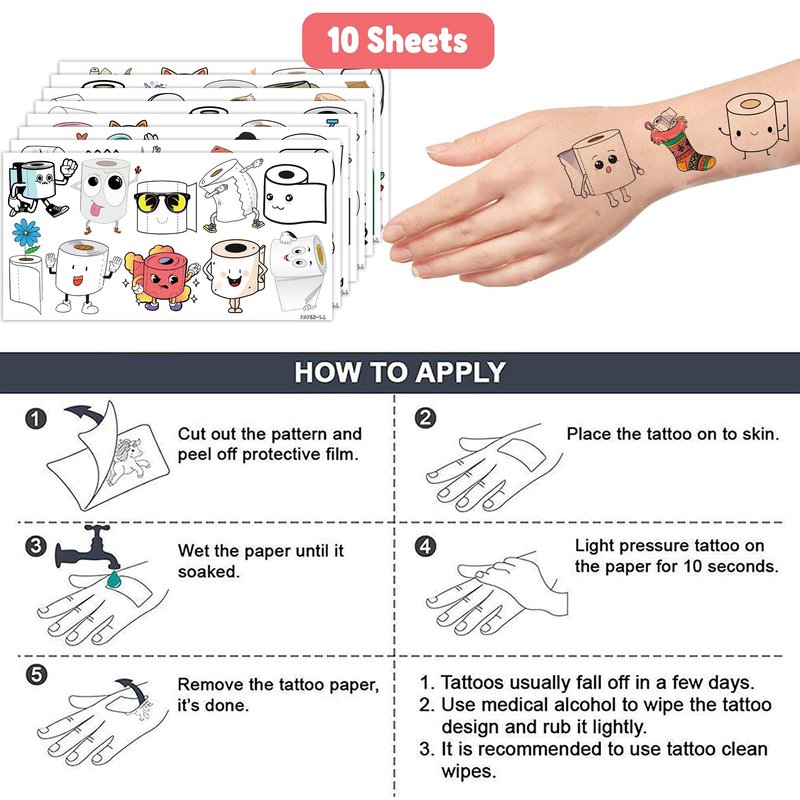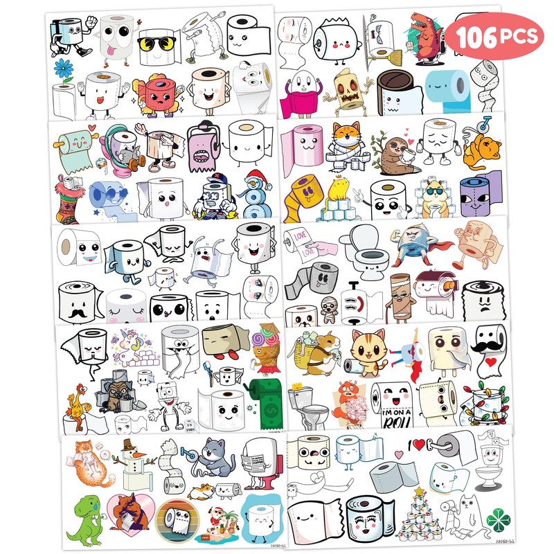 - 🧻 PERFECT TATTOOS FOR TOILET PAPER THEMED DECORATION: TOILET PAPER for people who love FUNNY, CUTE,. Featuring 10 sheets with 106 pcs of lovely, fun and colorful design. Each sheet measures 6.1 * 3.1 inches. You can temporarily tattoo them on your body or objects such as phones, bottles, laptop…