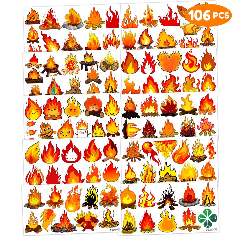 106 PCS Fire Campfire Temporary Tattoos Birthday Party Decorations Supplies Favors Fake Flame Firefighter Bonfire 3D Camping Foil Fire Fireman Decor Stickers Boys Girls Gift School Prizes Rewards
