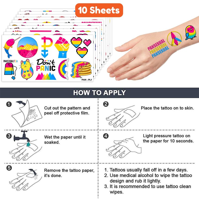 - Pattern rich: Pansexual Rainbow Pride Month Cute Pan Flag Gay LGBT Temporary Tattoos include 10 Sheets 106 PCS, the size of each sheet is 6.1 * 3.1 inches. Easy to share,even if a lot of people's parties, you can have a different tattoo with others.These adorable tattoos will keep you and your little ones – and their friends – occupied for a while. Great for playdates, parties, or rainy days.