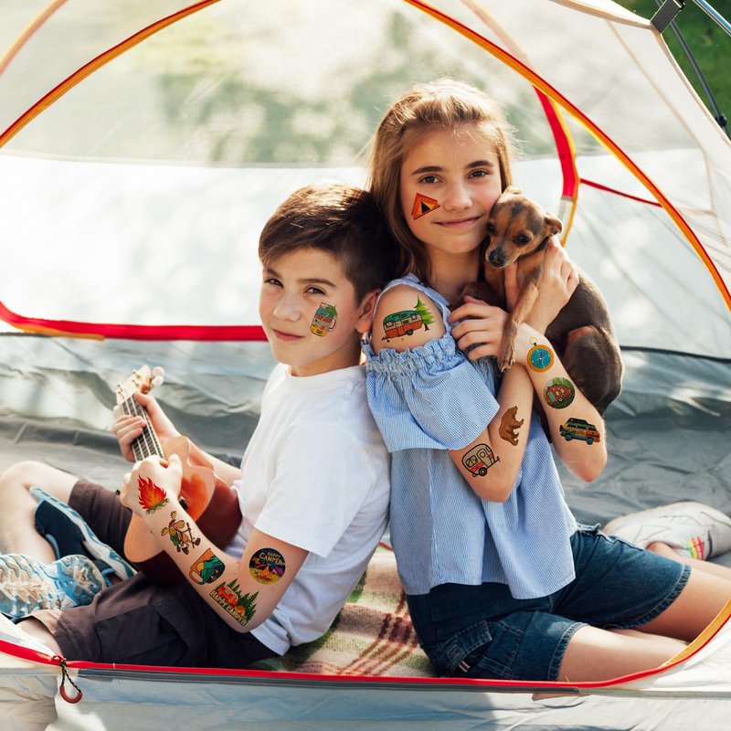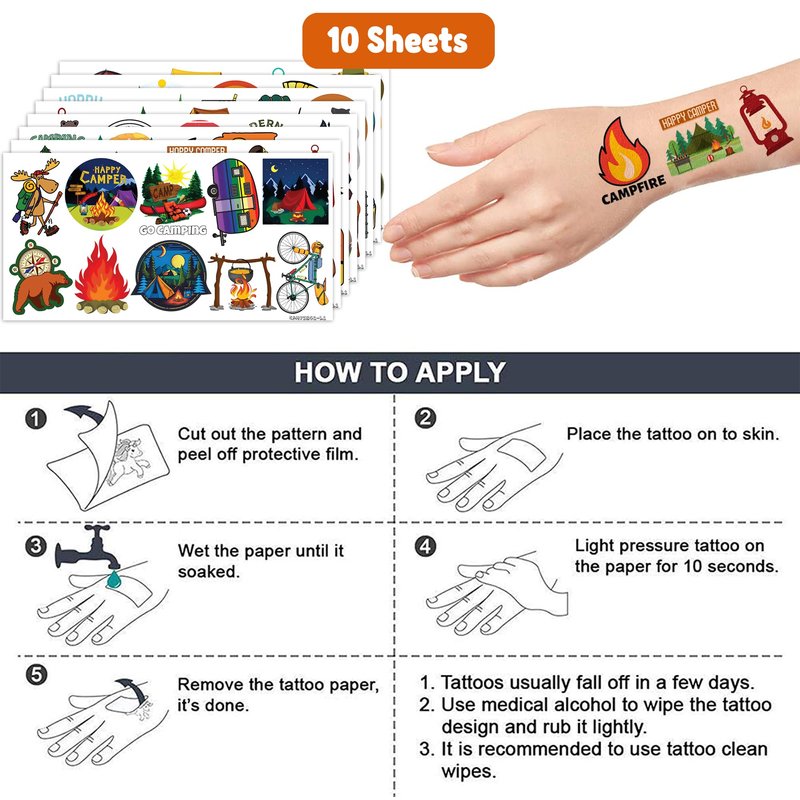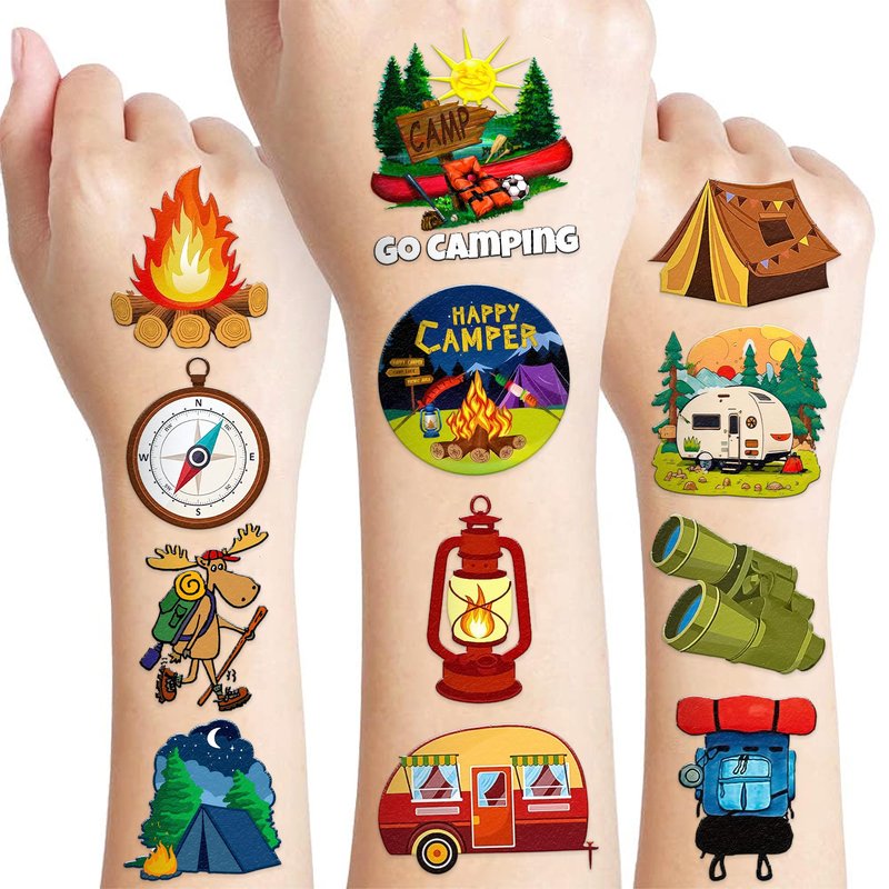 - 🏕️ [FUN GIFT IDEAS FOR CAMPING BIRTHDAY PARTY DECORATIONS FAVORS SUPPLIES]: CAMPING TATTOOS perfect for themed party, outdoor parties, birthday parties, school rewards and other party events. CAMPING tattoo are also interesting and lovely gifts for your children. I Complement your unique collection with a camp tempoary tattoo!