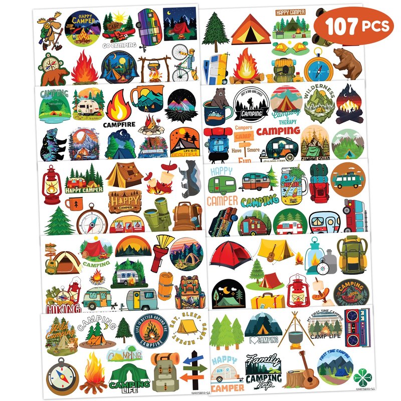 - 🏕️ [PERFECT TATTOOS FOR CAMPING -THEMED DECORATION] : CAMPING tattoos for people who love camp, camping, picnic. Featuring 10 sheets with 107 pcs of lovely, fun and colorful design. Each sheet measures 6.1 * 3.1 inches. You can temporarily tattoo them on your body or objects such as phones, bottles, laptop…