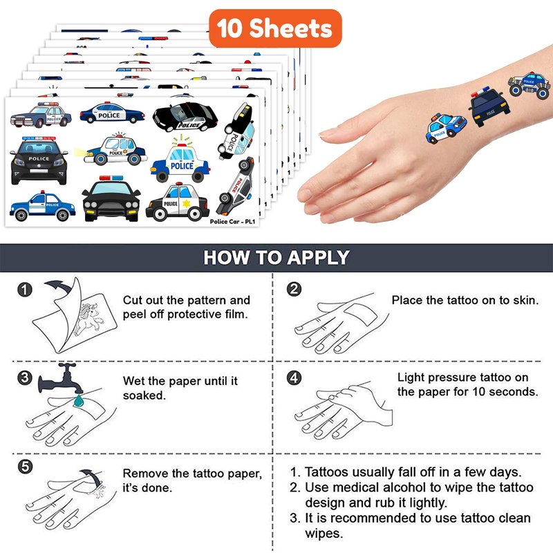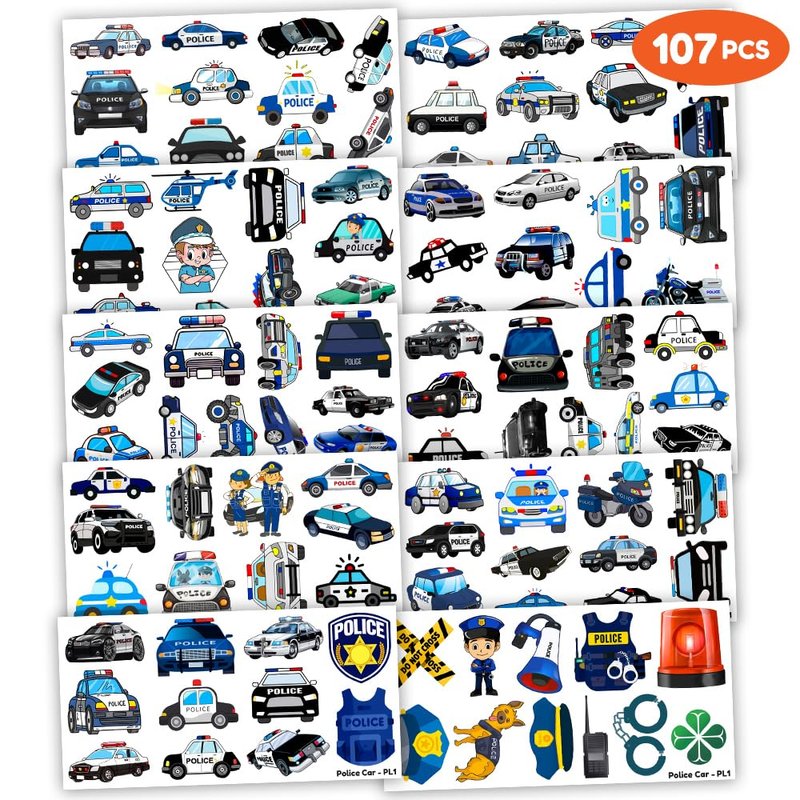 - Pattern rich: Police Car Cute Cop Officer Policeman Blue Temporary Tattoos include 10 Sheets 107 PCS, the size of each sheet is 6.1 * 3.1 inches. Easy to share,even if a lot of people's parties, you can have a different tattoo with others.These adorable tattoos will keep you and your little ones – and their friends – occupied for a while. Great for playdates, parties, or rainy days.