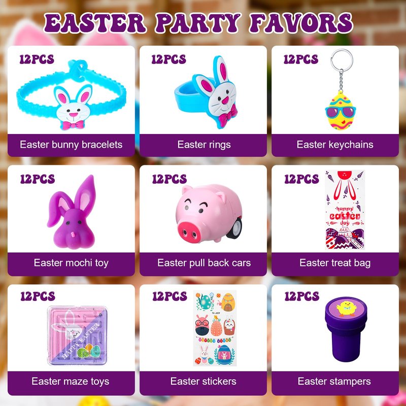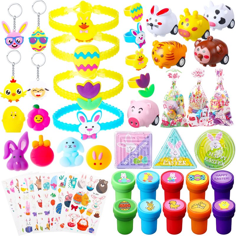 - Easter Party Favors: you will receive a total of 108 pieces Easter party supplies, including 12 pieces Easter bunny bracelets, 12 pieces Easter rings, 12 pieces Easter keychains, 12 pieces Easter toys, 12 pieces Easter pull back cars, 12 pieces Easter treat bags, 12 pieces Easter maze toys, 12 pieces Easter stickers, 12 pieces Easter stampers, different items with adequate quantity to satisfy your diverse and Easter using, decorating and sharing needs