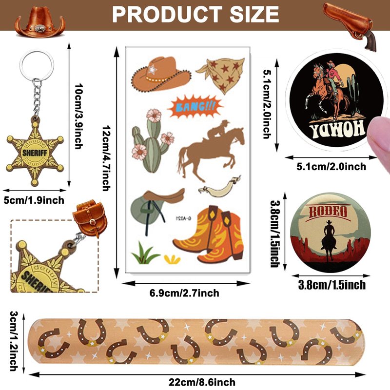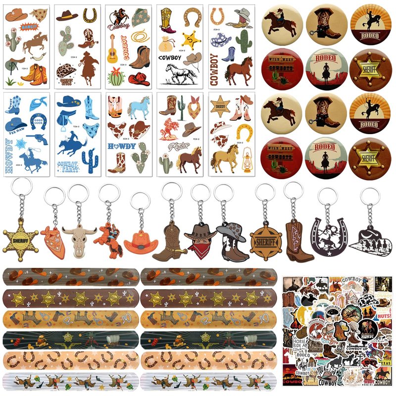 - Package Includes: You will receive a set of western party favors, 12 pieces cowboy slap bracelets in 6 styles, 12 pieces cowboy silicone keychain in 12 styles, 12 pieces cowboy temporary tattoos in 12 styles, 12 pieces button pins in 6 styles, 60 pieces different styles cowboy waterproof stickers, plenty of quantity to meet your western themed party needs