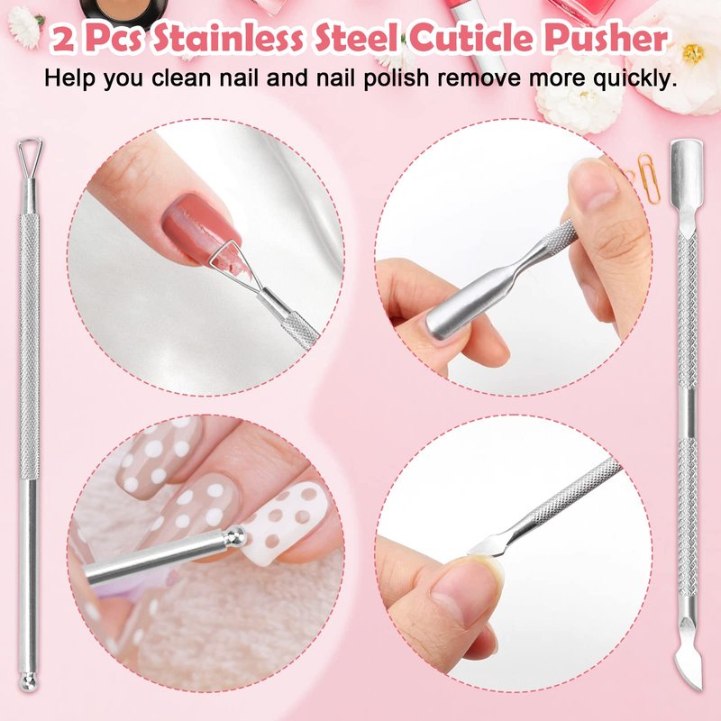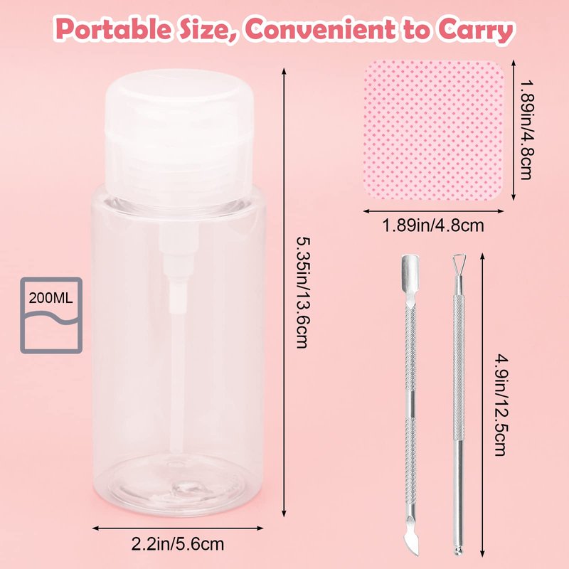 - 【Extra Nail Polish Remover Tools】: The package includes a 200ml plastic bottle, a top pump design more convenient for use, suited for containing various liquids; the other 2 pcs stainless steel cuticle pusher could help you cut and polish nails, remove nail polish, durable and reusable.
