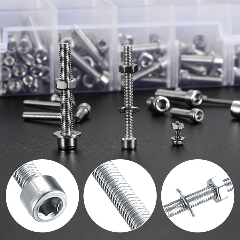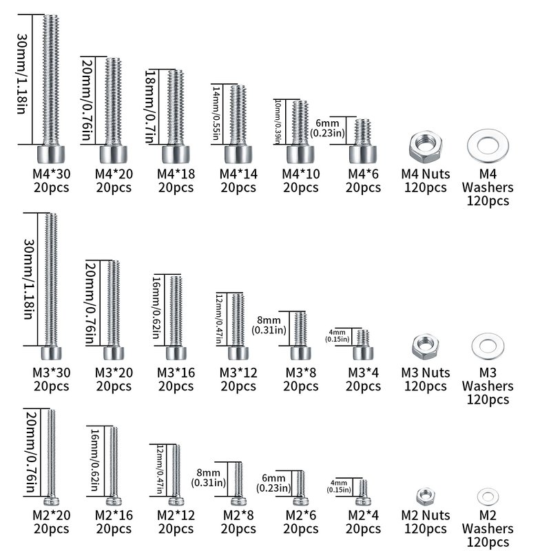 - Package Includes: You will receive 1080 pcs hex socket head bolts and nuts and washers, size including: m2x20mm, m2x16mm, m2x12mm, m2x8mm, m2x6mm, m2x6mm, m2 washers, m2 nuts, m3x30mm, m3x20mm, m3x16mm, m3x12mm, m3 x8mm, m3x4mm , m3 washers, m3 nuts, m4x30mm, m4x20mm, m4x18mm, m4x14mm, m4x10mm, m4x6mm, m4 washers, m4 nuts, rich in quantity and size to meet the needs of daily use.