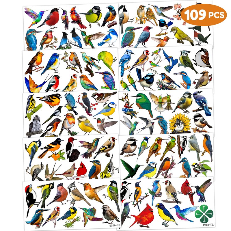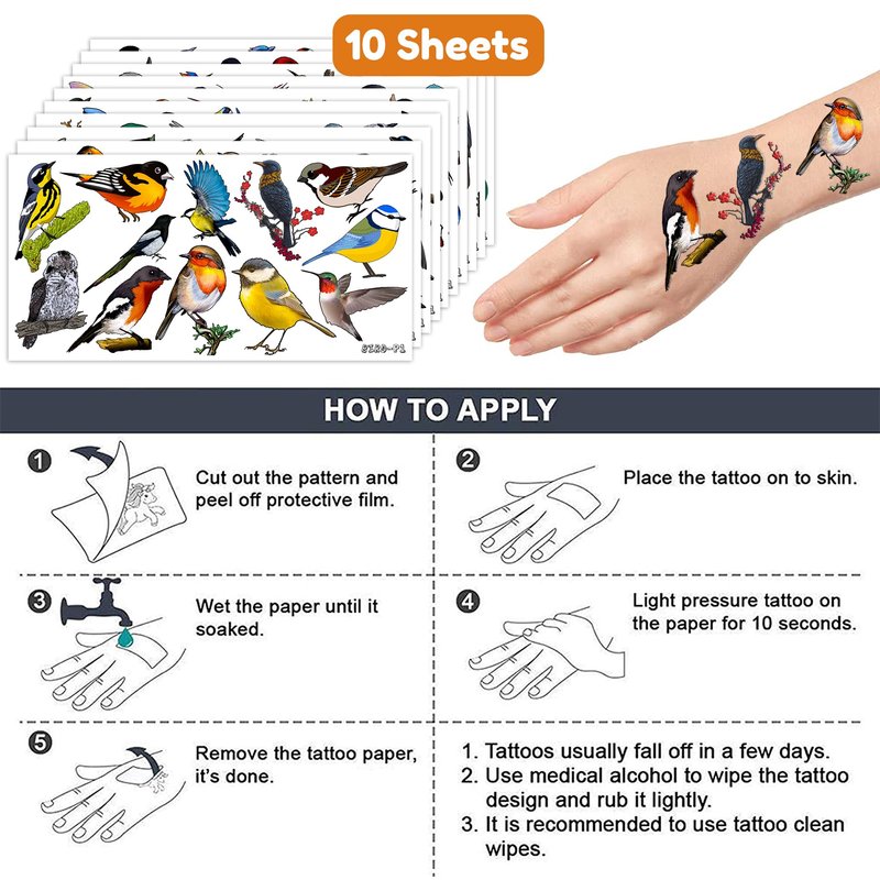 - 🐦⬛BIRD PARTY DECORATIONS: Hi everyone! An amazing set of 10 sheets including 109 a size of 6.1 by 3.1 inches. These BIRD tattoo pieces will be sent to you quickly, place your order to get these temporary tattoos.