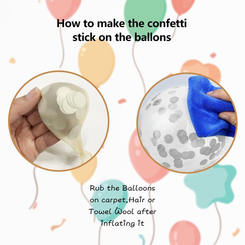 - TIPS: After blowing up the confetti balloons,you can shake it and gently rub it on your hair,the confetti will stick to the side, which can make your balloons much more beautiful.