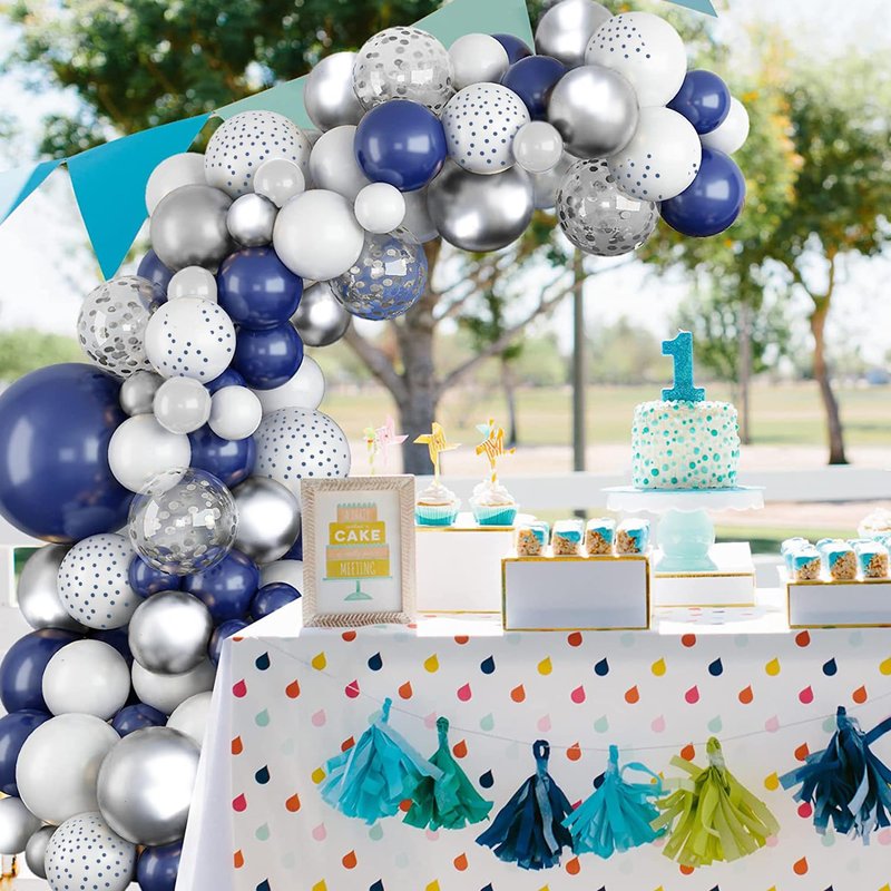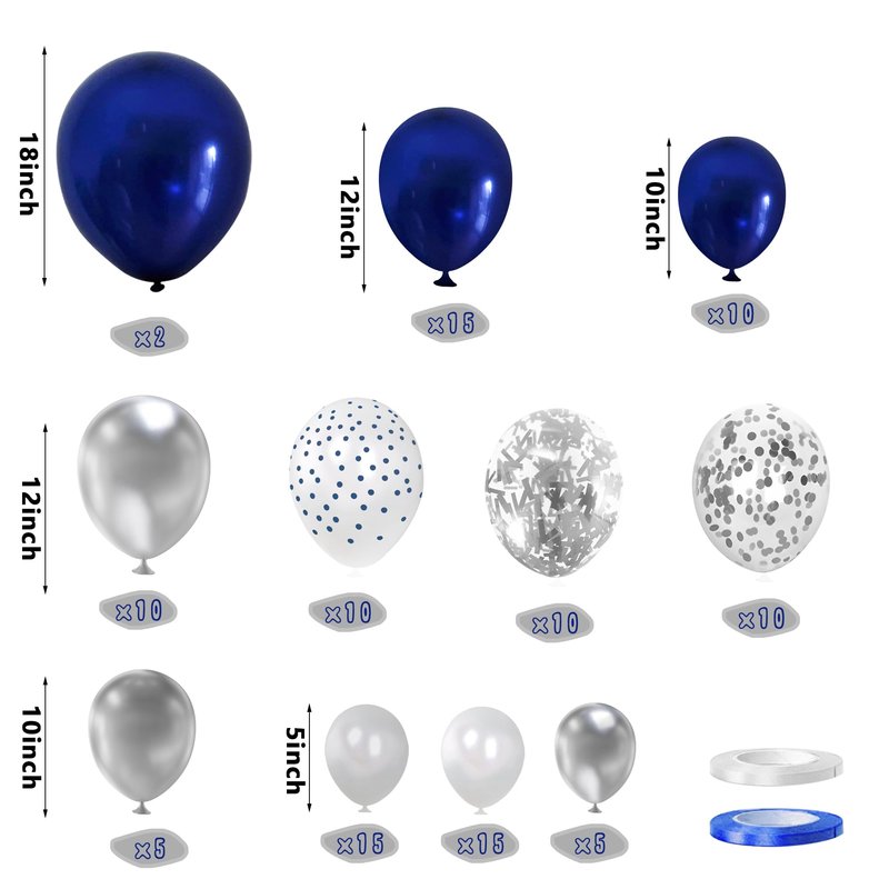 - PACKAGE: The package contains 35pcs silver balloons,20pcs silver confetti balloons,27pcs navy blue balloon,10pcs white navy blue dot balloons,15pcs white balloons and 2pcs ribbon roll.