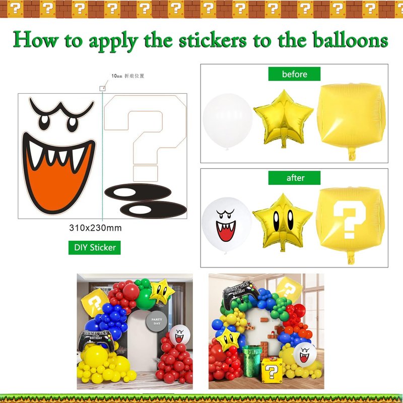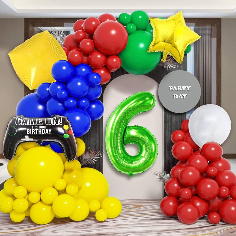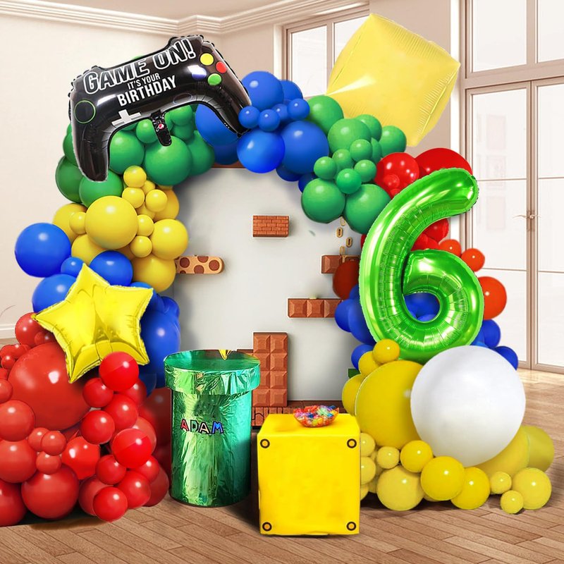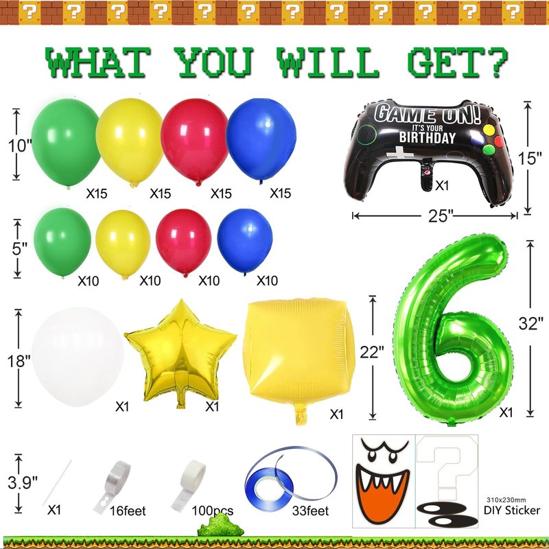 - šć109PCS All in 1 PackagećYou will get 109PCS All in 1 Package including Red/Blue/Green/Yellow Latex Baloons in 2 sizes: 5/10 inch, with 4 tools enough for 12-16FT Garland Arch, in addition 1pc 36" Jumbo Game Controller Foil Balloon, 1pc 22" yellow question mark block balloon , 1pc 18" king boo balloon, 1pc 18"super star foil balloon and 1pc digit number balloon in 32inch. Enough quantity for a perfect and joyful Mario Theme Birthday Party.
