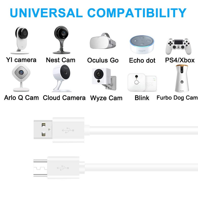 - 【Extensive Compatibility】 This Micro usb power extension cord is compatible with Wyze Cam v3 v2, WyzeCam Pan, Amazon Cloud Camera, Blink, YI Dome Camera, YI Home Camera, Nest Cam Indoor, Tt also compatible for xBox One Controller,PS4 Controller,Fire Kindle tablets.