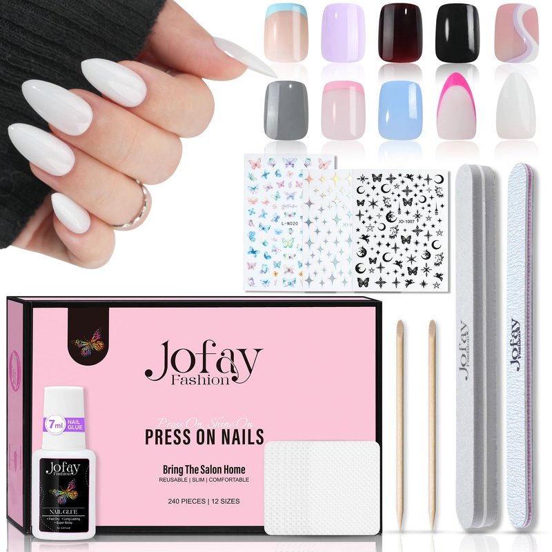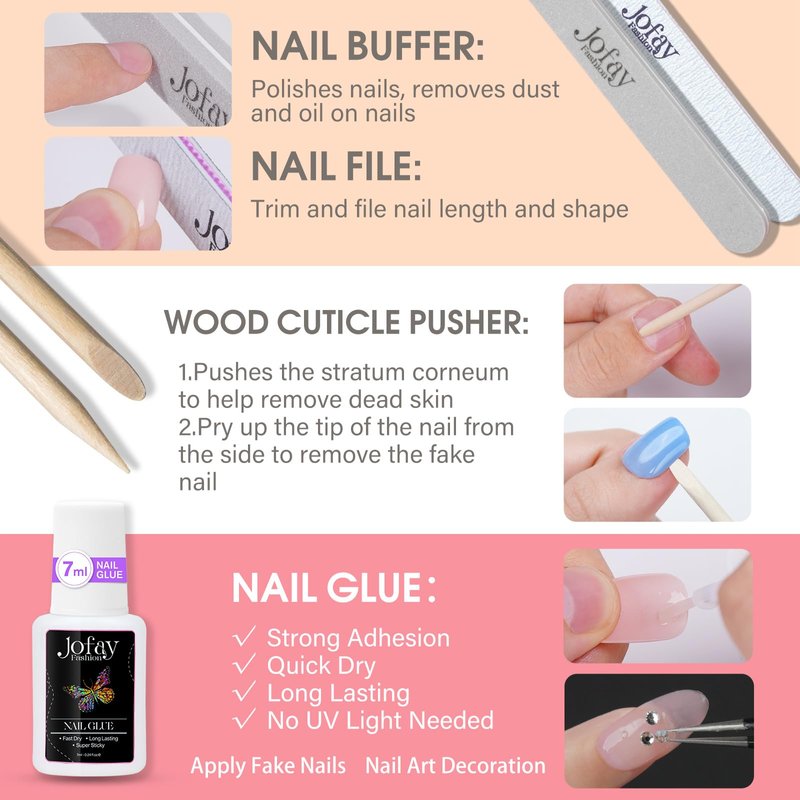 - 【💅 Reusable Press on Nails Kit for Easy Manicures】: 10 Styles 240 PCS acrylic fake nails square, 12 different sizes, that fits your every finger. Also includes a super strong nail glue,100/180 grit nail file and buffer, 2pcs orange sticks, 6pcs prep pads and a transparent box, don’t need to purchase anything else.