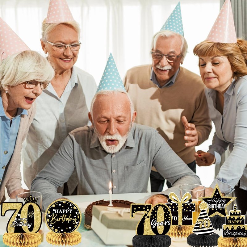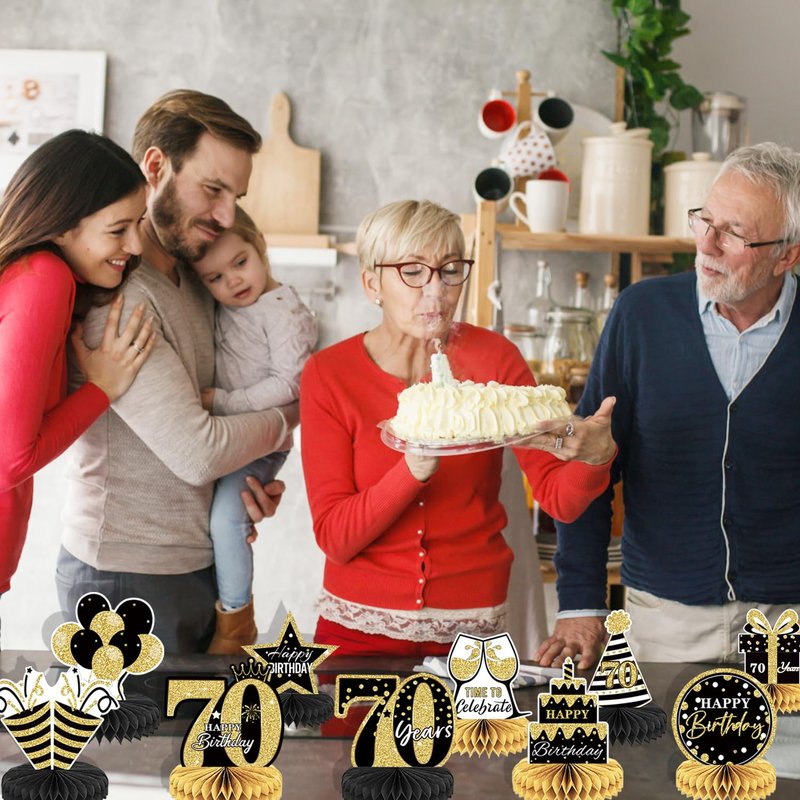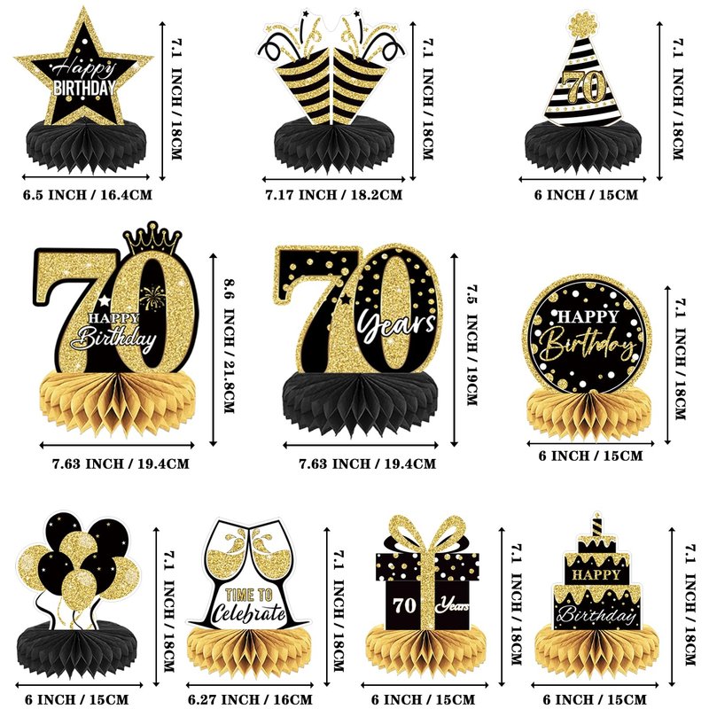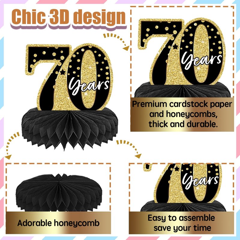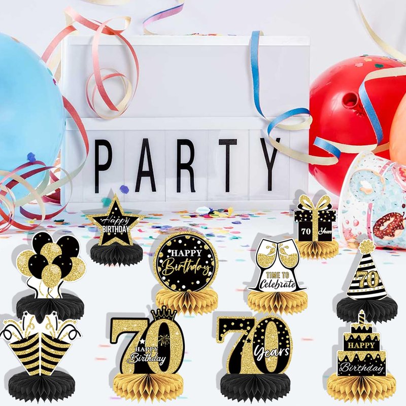 10PCS Black Gold 70th birthday decorations for Men and Women,70 birthday Decorations Honeycomb table centerpieces,Happy 70th Birthday Centerpieces Tables Toppers,70th Birthday Table Sign Decor