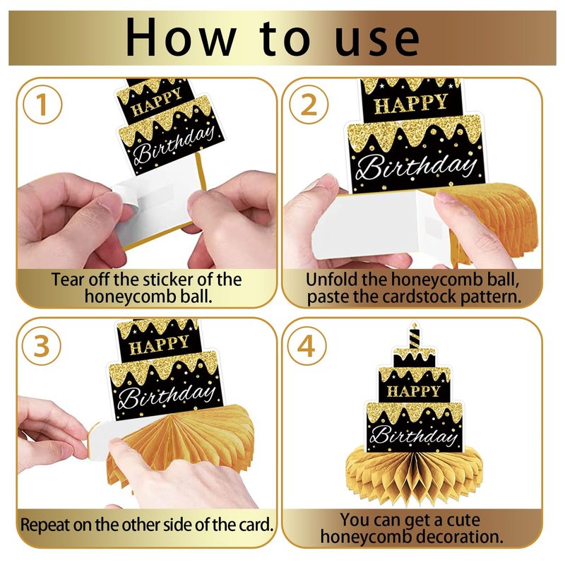 - The easiest way to use: Step1, tear off the sticker of the honeycomb ball. In the second step, glue the honeycomb ball to the fixed area on the card. Step 4, finally put it on the table. It's easy and you can save a lot of time.