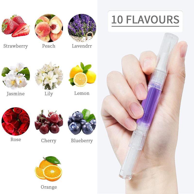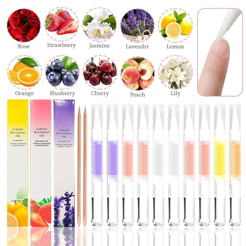 - 💅15/10 CUTICLE OIL PEN SET: This Cuticle oil pens bulk is perfect for nail care, it is helpful for nail nourishment and keeping nails healthy, and can be prevent the formation of agnail. This Nail Cuticle Oil Pen set included15/10 kinds of taste: Rose, strawberry, jasmine, lavender, lemon,Orange, blueberry, cherry, peach, lily,/Pineapple, Aloe, Watermelon, Osmanthus, Apple.