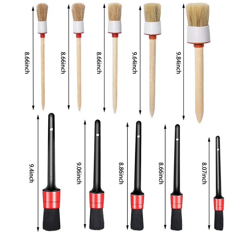 - 【Natural Wood Handle Detailing Brush Set】These auto detailing brushes have round shape and smooth surface, anti-slip and offer comfortable grip. Gentle and soft car detailing brushes in 5 different sizes , perfect for you to clean the interior and exterior of the auto, the wheels, the dashboard, the wiper, the air vent, the glasses, the seats and other tiny places.
