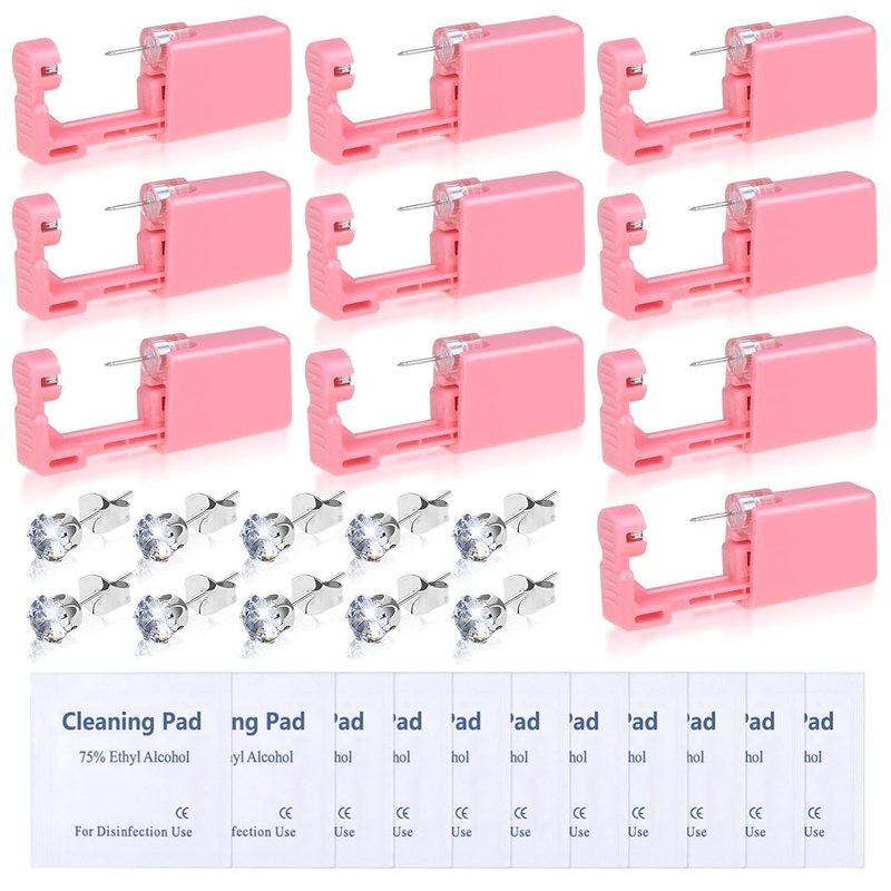 10 x Pink Disposable Ear Piercing Kit with 10 built-in ear studs