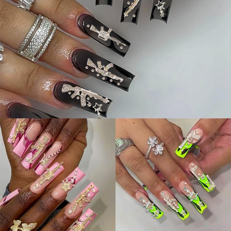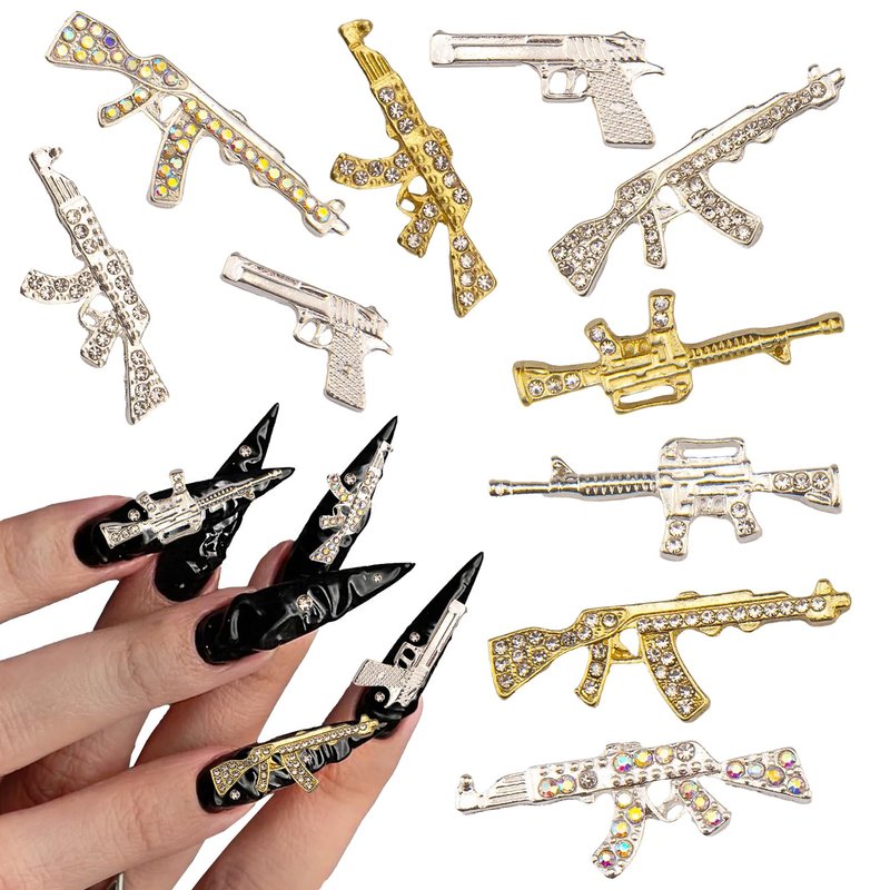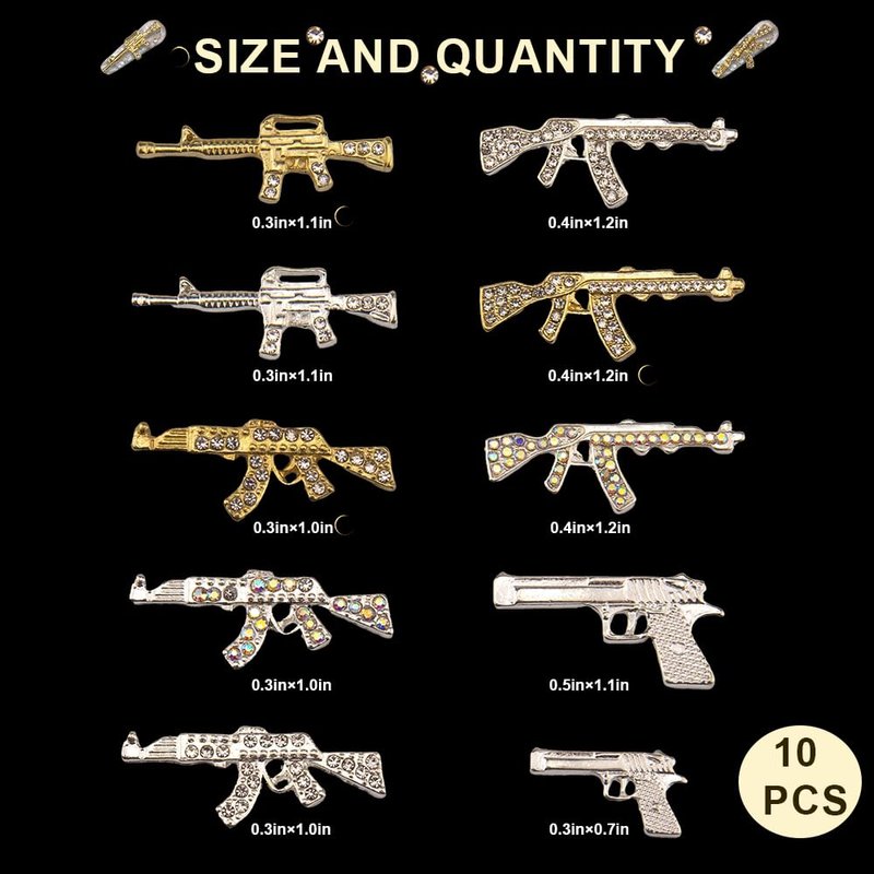- Distinctive Gun Designs: Includes 10PCS nail charms featuring various gun designs adorned with sparkling rhinestones, perfect for adding a bold touch to your nail art.