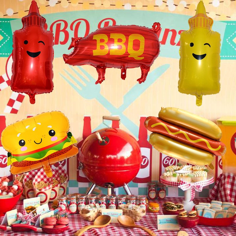 - BBQ Birthday Party Decorations: You will get 10pcs BBQ foil balloons, 2pcs Pig balloons, the size is: 31.5 x 23.6 inch inch; 2pcs Hotdog balloons, the size is: 28.3 x 23.2 inch; 2pcs Hamburger balloons, the size is: 29.1x 22.4 inch; 2pcs Ketchup bottle balloons, the size is: 27.5 x 15.7 inch; 2pcs Mustard bottle balloons, the size is: 27.5 x 15.7 inch.