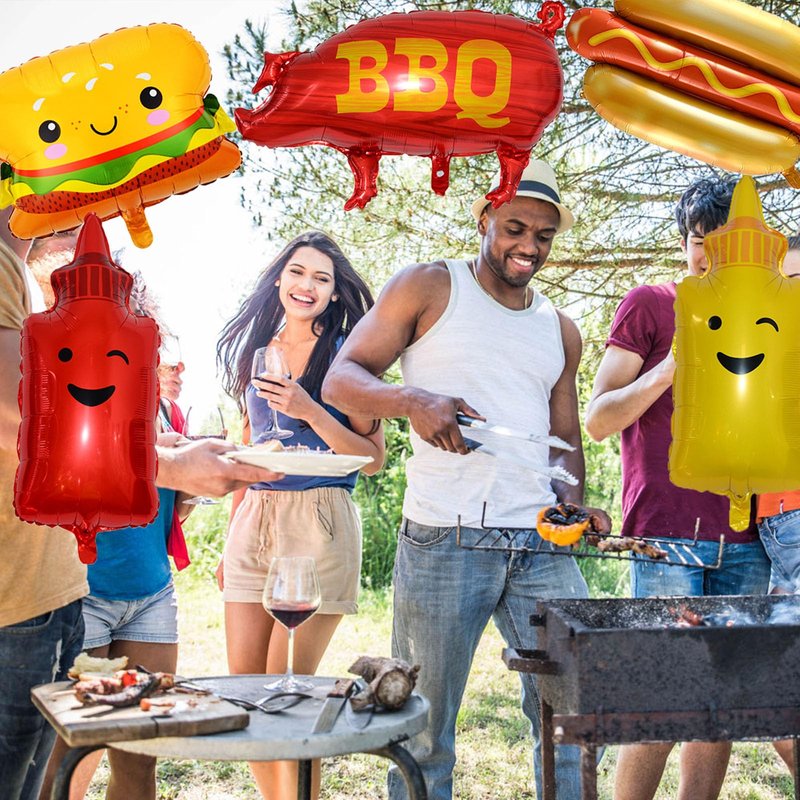 - Summer BBQ Party Balloons: The BBQ theme balloons are made of aluminum film, durable and reusable, lightweight and not easy to break. The adorable Pig, Hamburger, Hotdog, Ketchup, Mustard shaped foil balloons are all designed with openings that can seal automatically, which make it convenient to apply these balloons, no knots required, saving your time and energy, making your decorating work easier.