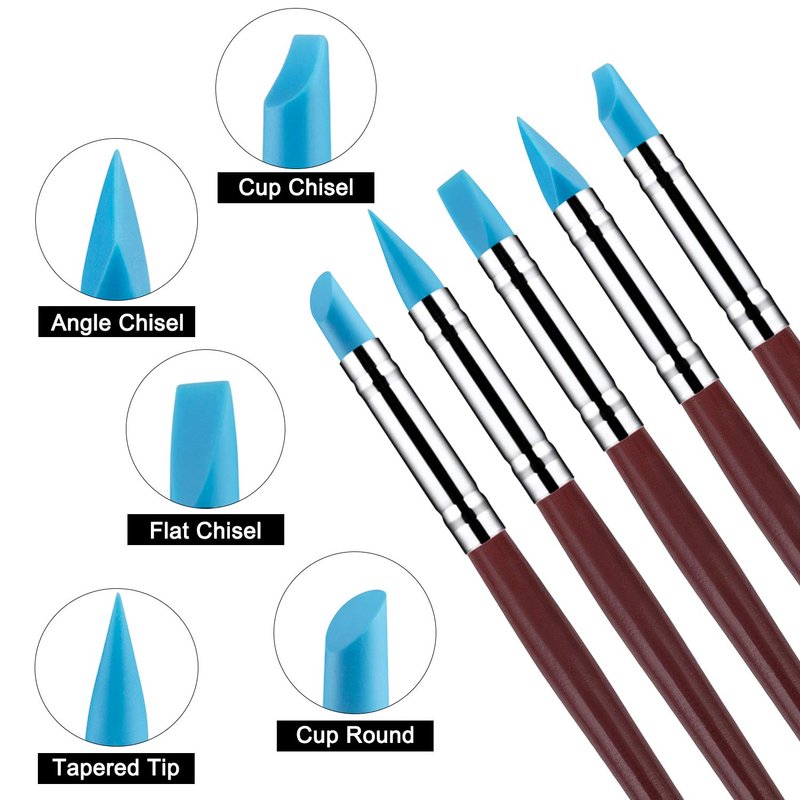 Rubber Tip Paint Brushes Of Feature Color: As The Picture Show, The Handle Of Pen Is Dark Red, The Pen Tip Is Blue. Soft Silicon Head Will Not Absorb The Material Easy To Clean. Silicone Head: Taper Point, Angle Chisel, Flat Chisel, Cup Chisel, Cup Round; Can Be Used For Smoothing Out Scuffs On The Clay, Molding Soft Clay, Blending And Moving Color Around, Fondant, Cake Decorating, Fine Detail, Touch-Up Work And Remove The Fingerprints. Dotting Head Size:2.5mm/2mm/1.5mm/1mm And One Long Sharp Head. Package Include:1 Pack Of 5 * 2 Way Polymer Clay Tools And 1 Pack Of 5 Rubber Tip Paint Brushes.
