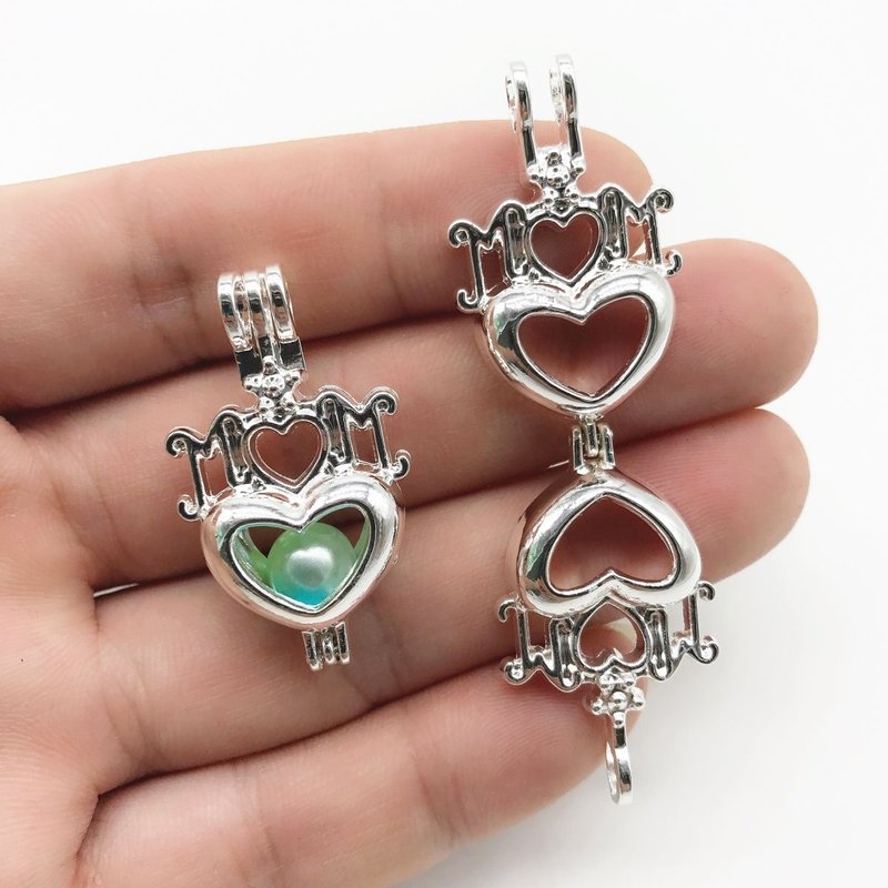 10pcs Silver Pearl Cage Locket Pendants, Essential Oil Diffuser DIY Necklace Bracelet Jewelry Making Craft, Bulk Beads Aromatherapy Diffuser Charms Gifts for Women Girls (MOM Heart)