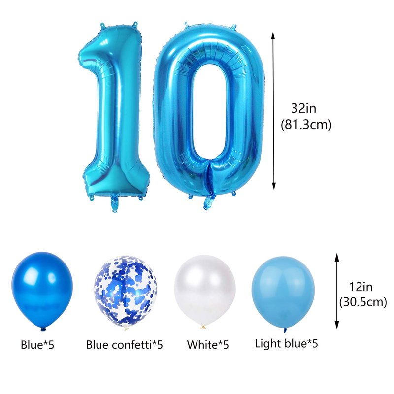 - Package included: 1* navy blue 'HAPPY BIRTHDAY' Bunting Banner, 1* blue DOUBLE DIGITS letter foil balloons separately, 1* number 10 balloons, 20 latex party balloons in 4 styles( 5* blue, 5* navy blue, 5* white, 5* blue confetti), 1* ribbon. Total 25packs in one package. It includes everything you'll need to celebrate your birthday party.
