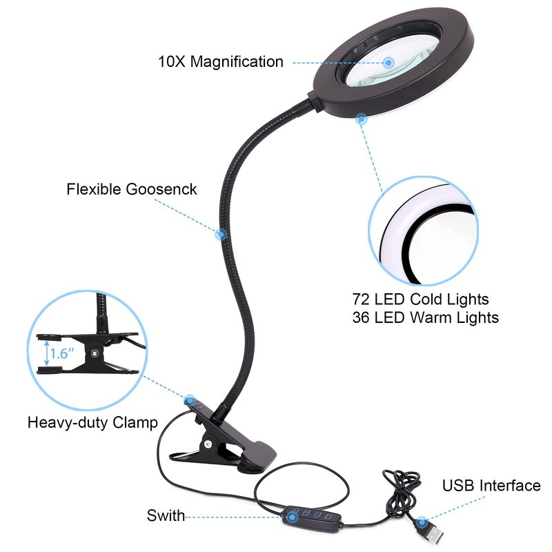 - 10X HD Magnifying Glass & USB Powered: The magnifying glass with light reading lamp uses thickened optical glass with high magnification with a magnification of up to 10X.