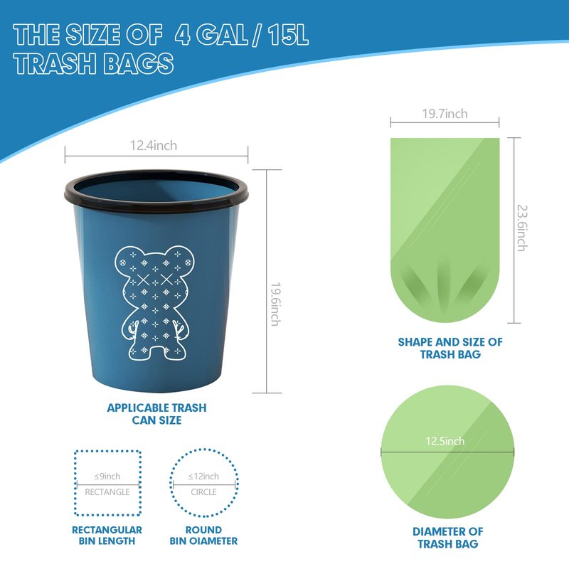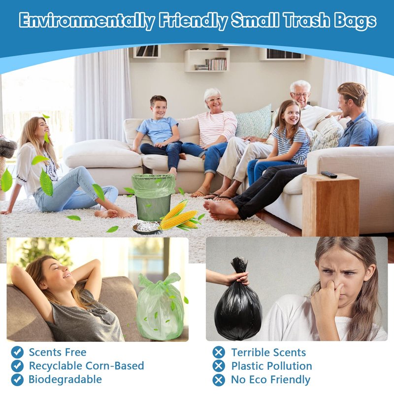 - 【BIODEGRADABLE&UNSCENTED GARBAGE BAGS】Aklyaiap trash bags 4 gallon easily tear and are scent free. Our small trash bag is slightly heavier and less stretchy than plastic. But that’s because they’re a corn product rather than petroleum, which is good.The small trash bags 4 gallon are made of a plant-based starch, so they are fully compostable and will biodegrade in the environment into other than microplastics. So if reducing plastic use is important to you, this could be a good choice!