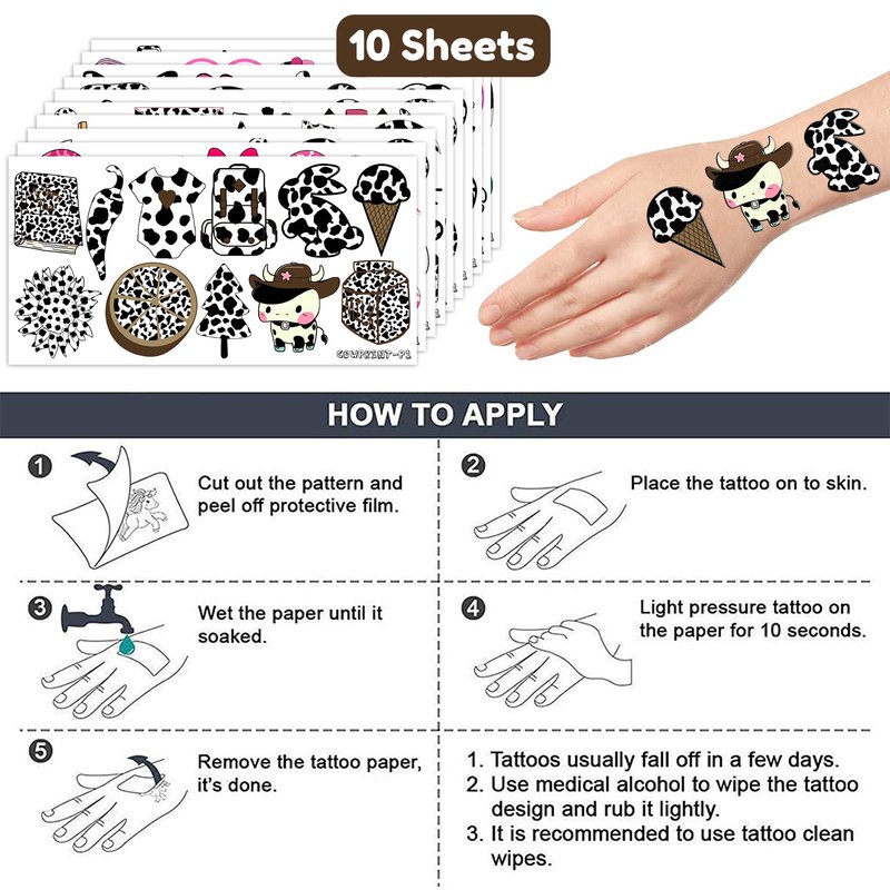 - 🐮COW PARTY SUPPLIES: Hi everyone! An amazing set of 10 sheets including 110 a size of 6.1 by 3.1 inches. These COW PRINT tattoo pieces will be sent to you quickly, place your order to get these temporary tattoos.