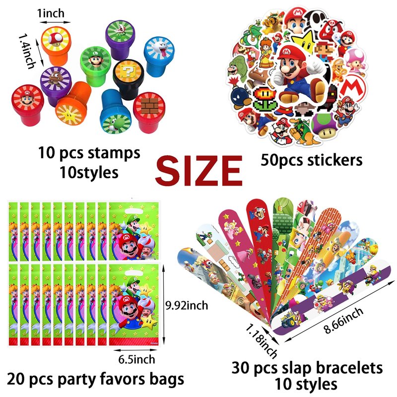 If you are a big fans, you can't miss the inspired stamps. Classic slap bracelets for children of all ages, making them their favorite game characters at parties. Perfect for the party to add more fun and create a good time. It can not only be the best favors for birthday, children's day and christmas, but also as a class prize to motivate children, and will be loved by everyone. Practical fun children's stamps and mario classic gift bags are also essential party supplies