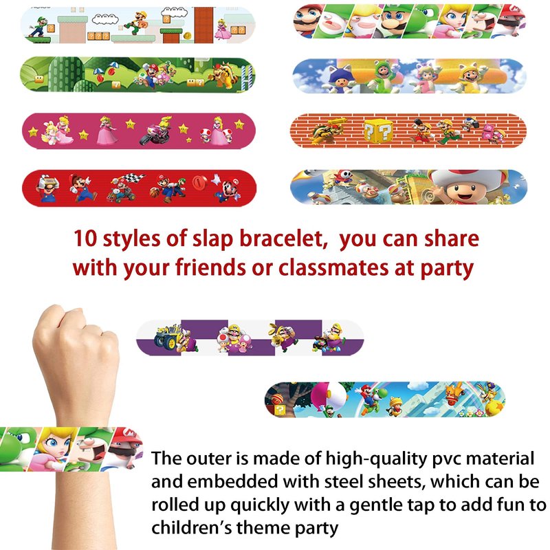 - High Quality: Slap bracelets are made of a high quality pvc outer shell with a tough ruler strap embedded inside. They can provide great flexibility and stretch for long time wearing. Candy bags, stamps and mario stickers are also made of safe material