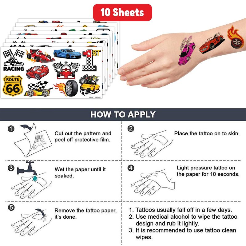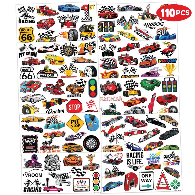 - 🏎️ [PERFECT TATTOOS FOR RACE CAR -THEMED DECORATION] : RACE CAR tattoos for people who love the car, Race Car. Featuring 10 sheets with 110 pcs of lovely, fun and colorful design. Each sheet measures 6.1 * 3.1 inches. You can temporarily tattoo them on your body or objects such as phones, bottles, laptop…