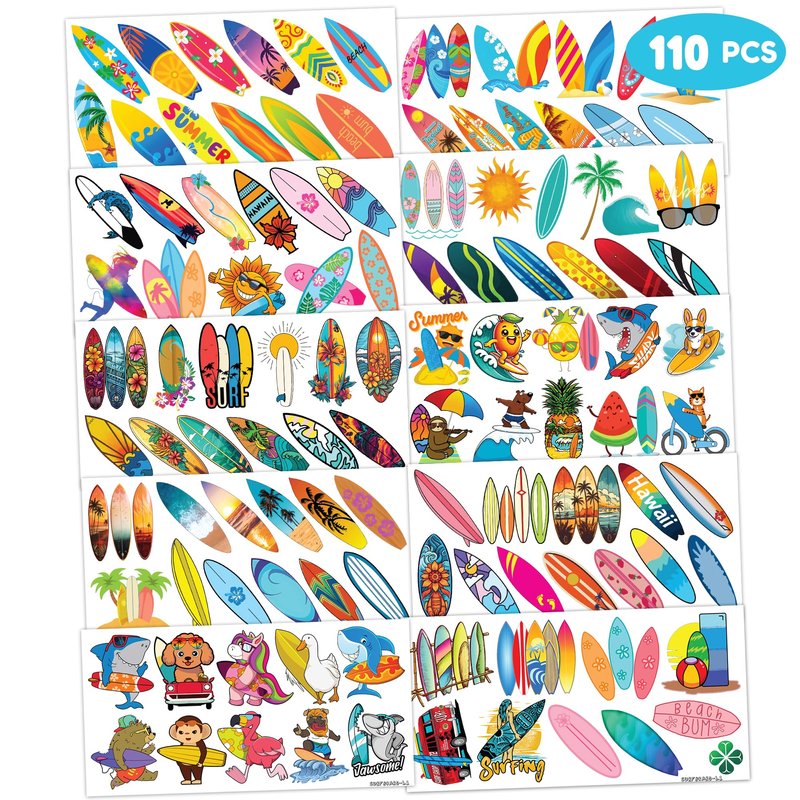 - π PERFECT TATTOOS FOR SURFBOARD THEMED DECORATION: SURFBOARD TATTOOS for people who love Summer Surfing Surf Surfboard Beach California Hawaiian Ocean Surfer Surfboard Tropical. Featuring 10 sheets with 110 PCS of lovely, fun and colorful design. Each sheet measures 6.1 * 3.1 inches. You can temporarily tattoo them on your body or objects such as phones, bottles, laptopβ¦