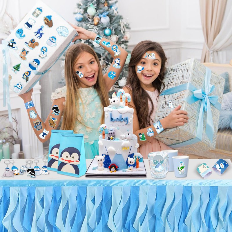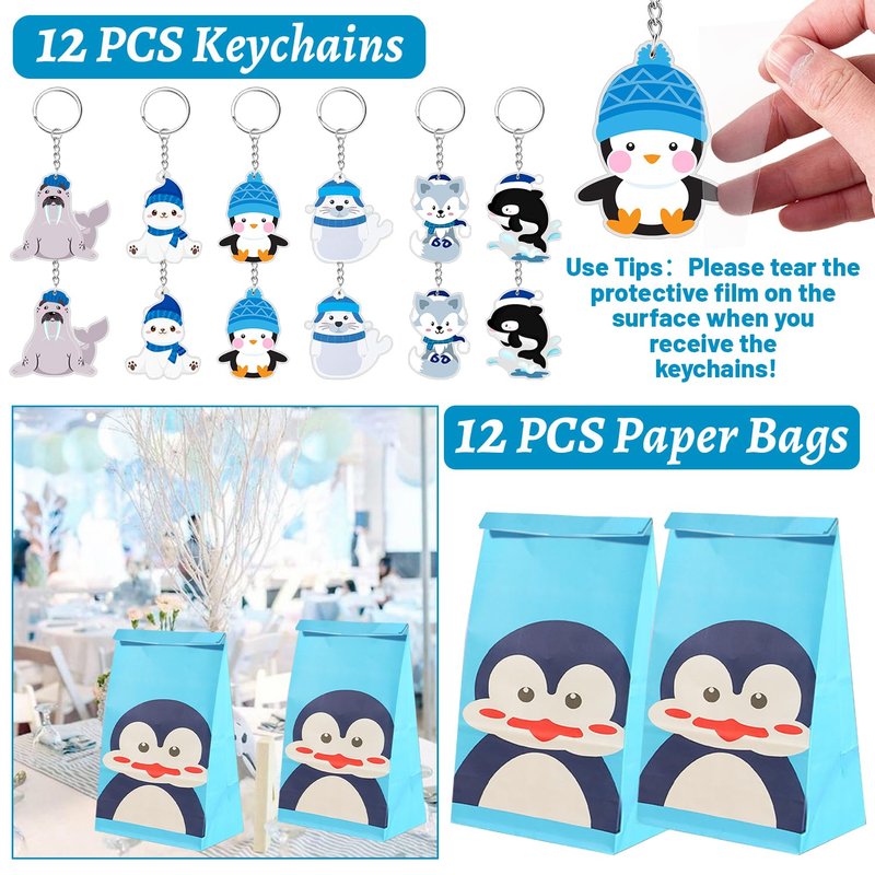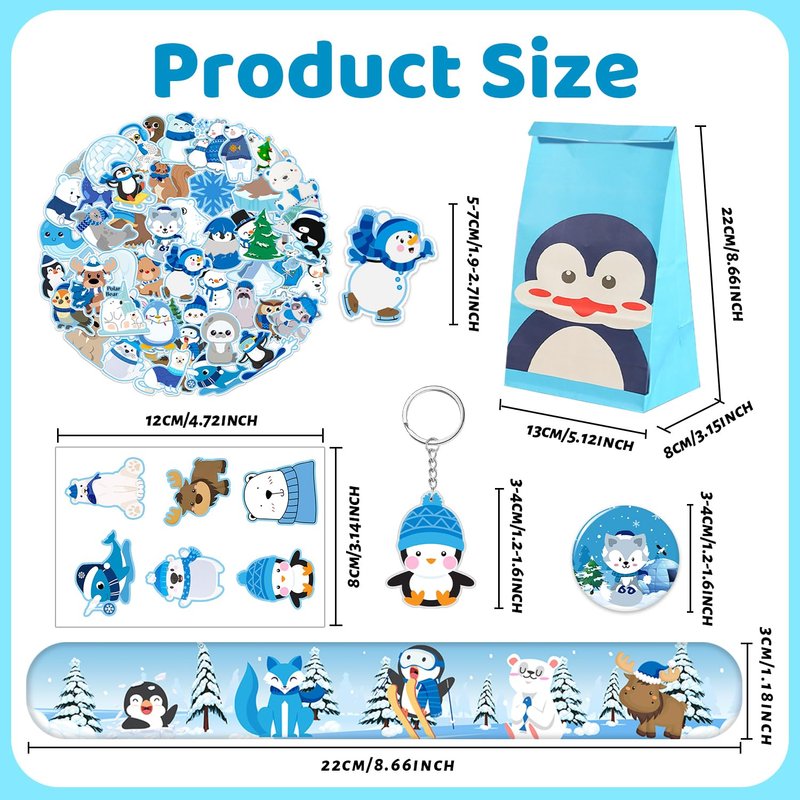 - Winter Arctic Polar Animals Party Favors: Arctic animal party supplies include 12 sheet arctic animal temporary tattoos (72 Patterns), 50 pcs arctic animal stickers, 12 pcs arctic animal slap bracelets, 12 pcs arctic animal badges, 12 pcs arctic animal acrylic keychains, 12 pcs gift bags with sealing stickers, Enough quantity to meet your arctic polar animal party needs