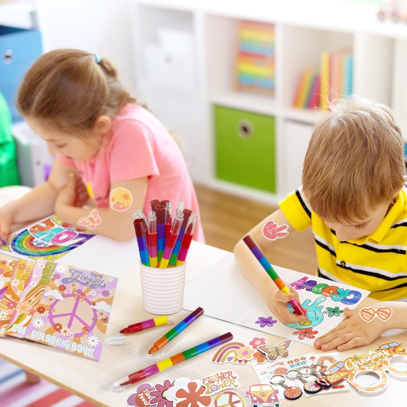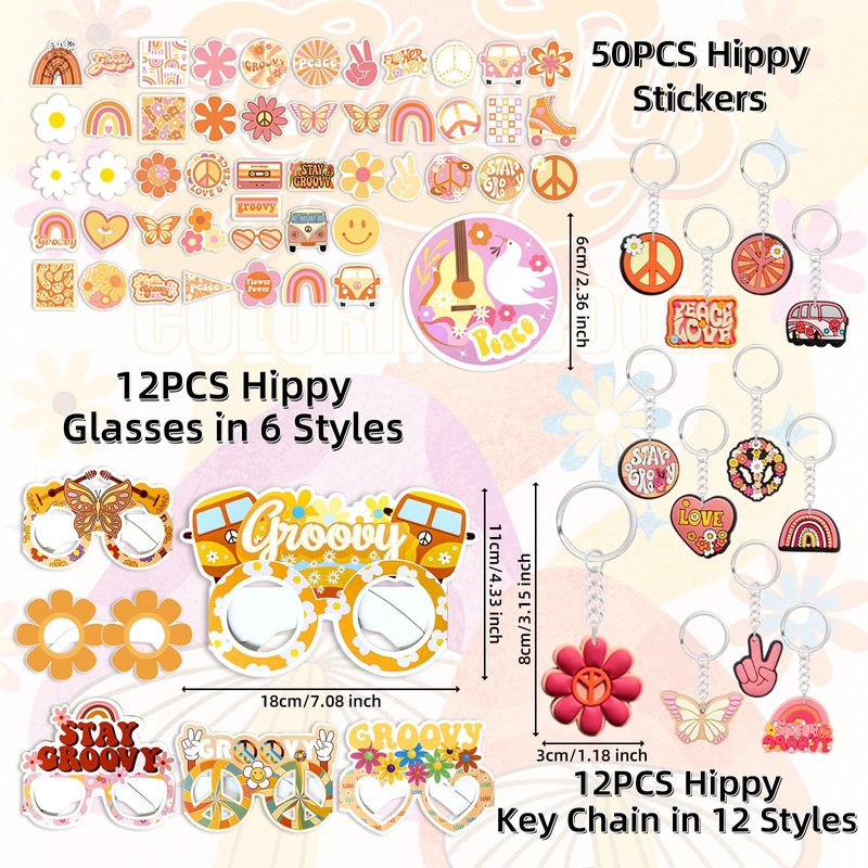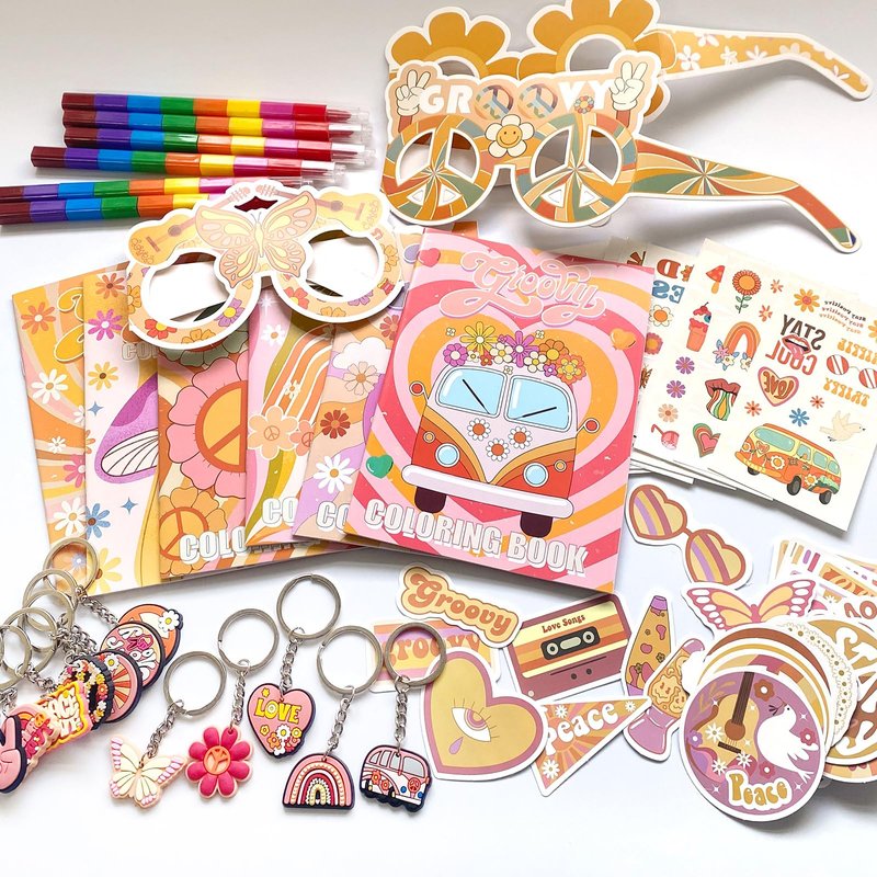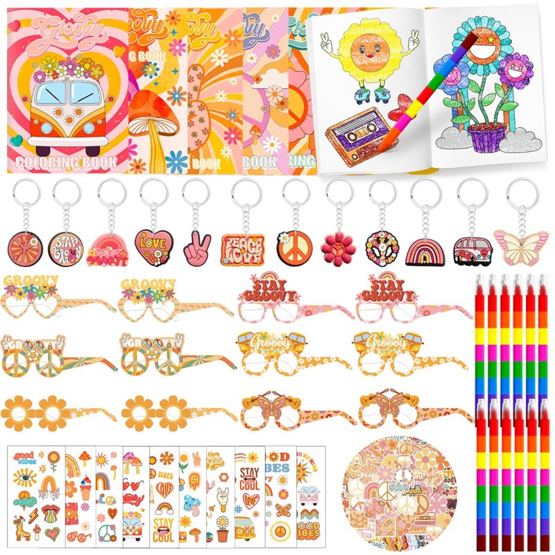 - Super Valued Groovy Party Favors for kids:12PCS Groovy Boho Coloring Books;12PCS Eight Color Crayons;12PCS Groovy Boho Keychains, 12PCS Groovy Boho DIY Stickers;12PCS Groovy Paper glasses;50PCS Random Groovy Stickers