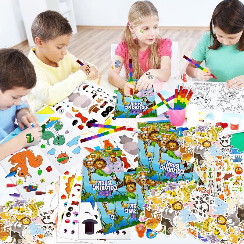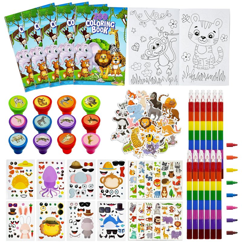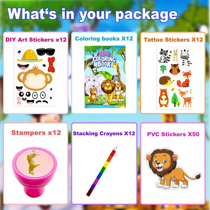 - Jungle Safari Favors Set: you will get a total of 110 pcs wild animals party favors, including 12 coloring books(12 pages per book), 12 rainbow stacking crayons(8 colors),12 tattoos, 12 stampers, 12 DIY Art Craft stickers, 50 pvc stickers, sufficient quantity, and various styles enrich your zoo theme party