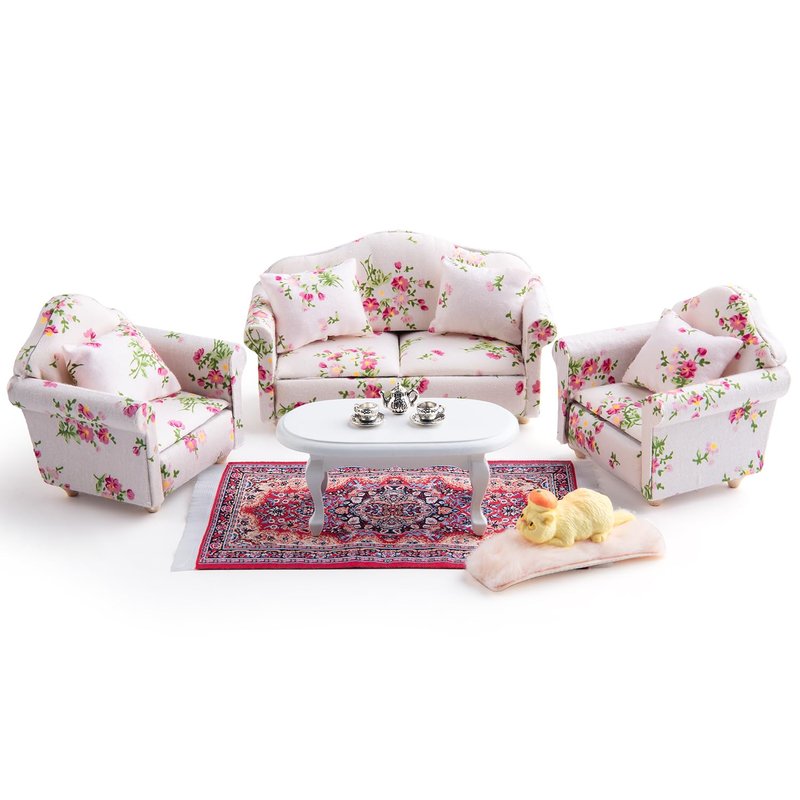 - 【Package includes】You can get 2 single sofas, 1 double sofa, 4 pillows,1 coffee table, 1 tea set, 1 rug and 1 kitten, This mini sofa set features a clever and innovative design that perfectly complements any dollhouse interior.