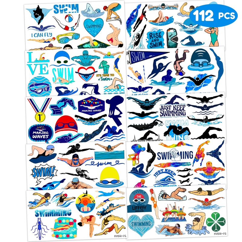 - 🏊SWIM PARTY DECORATIONS: Hi everyone! An amazing set of 10 sheets including 112 a size of 6.1 by 3.1 inches. These SWIM tattoo pieces will be sent to you quickly, place your order to get these temporary tattoos.