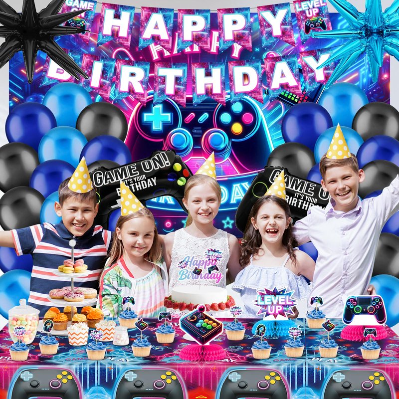 - Comprehensive Party Kit: This 112-piece set covers all your gaming party needs! It includes 1 large gaming backdrop, 1 "Happy Birthday" banner, a complete blue balloon arch kit with assorted size balloons, a thematic tablecloth to set the stage, an array of cake toppers to bring your dessert to life, and 3 pcs striking centerpiece to tie it all together. This kit is your one-stop solution for creating a memorable gamer's paradise.