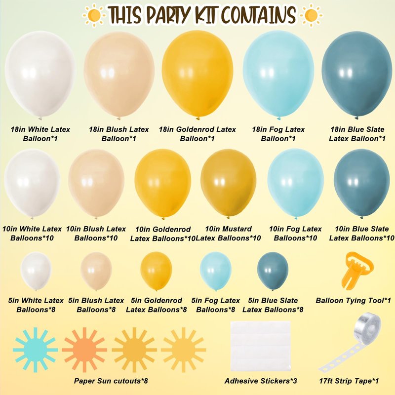 - Value Package - Our here comes the son baby shower decorations include 8pcs sun cutouts, 60pcs 10inches latex balloons, 40pcs 5inches latex balloons, and 5pcs 18inches latex balloon. The package also comes with 3 balloon accessories, including balloon arch strip tape, adhesive stickers, and a tying tool. This retro boho sun party supplies kit includes everything you need to create a fantastic balloon garland for your party!