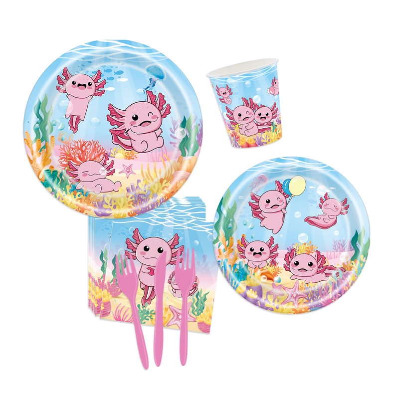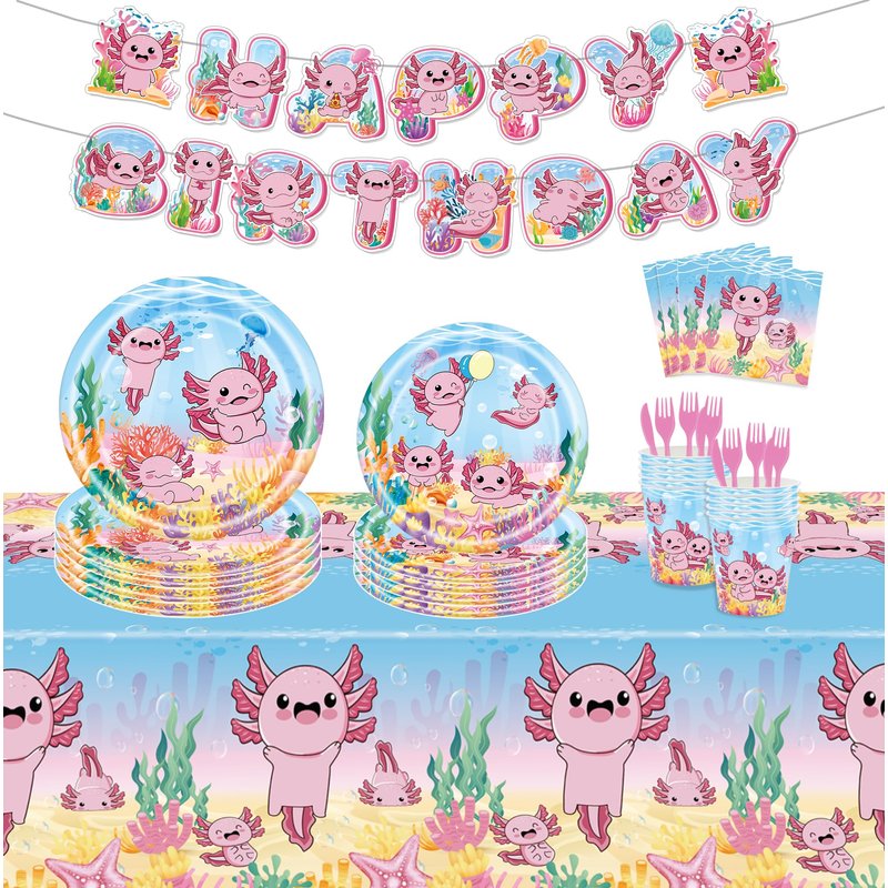 - 【Birthday Tableware Set】Our axolotl birthday party supplies contains 10pcs 7’’ plates, 10pcs 9’’ plates, 10pcs paper cups, 10pcs forks, 10pcs knives, 20pcs napkins and tablecloth, also contains 1* happy birthday banner, 1*cake topper, 24pcs cupcake toppers, 16pcs balloons, 1*backdrop, sufficient quantity to perfectly meet your daily use and decoration needs.