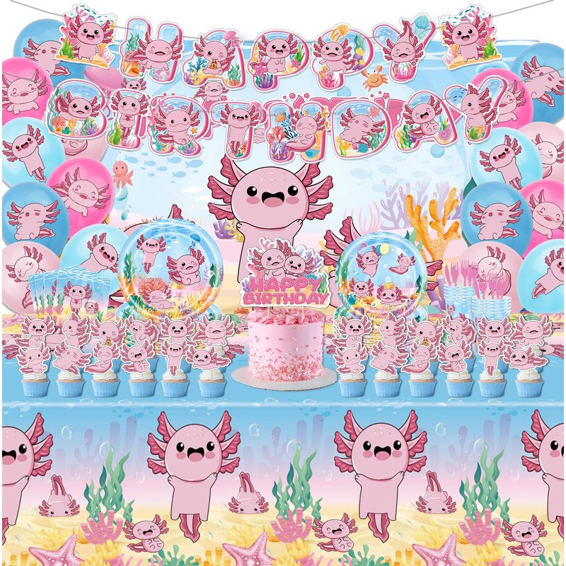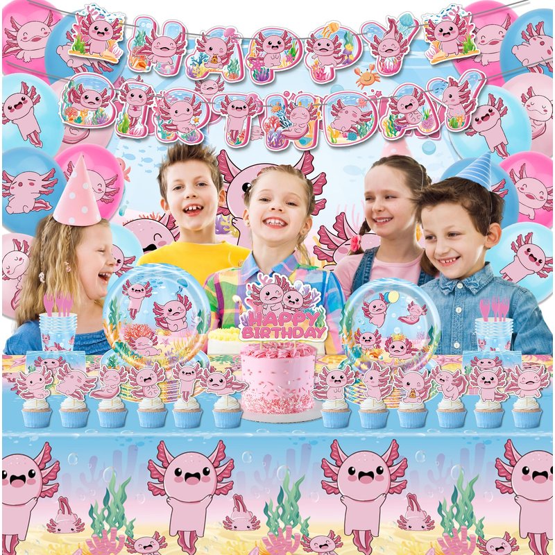 114Pcs Axolotl Birthday Party Supplies Include Happy Birthday Banner-Backdrop-Balloons-Cake Topper-Cupcake Toppers-Tableware-Plates-Napkins-Cups-Cutlery-Tablecloth for Axolotl Party Decorations