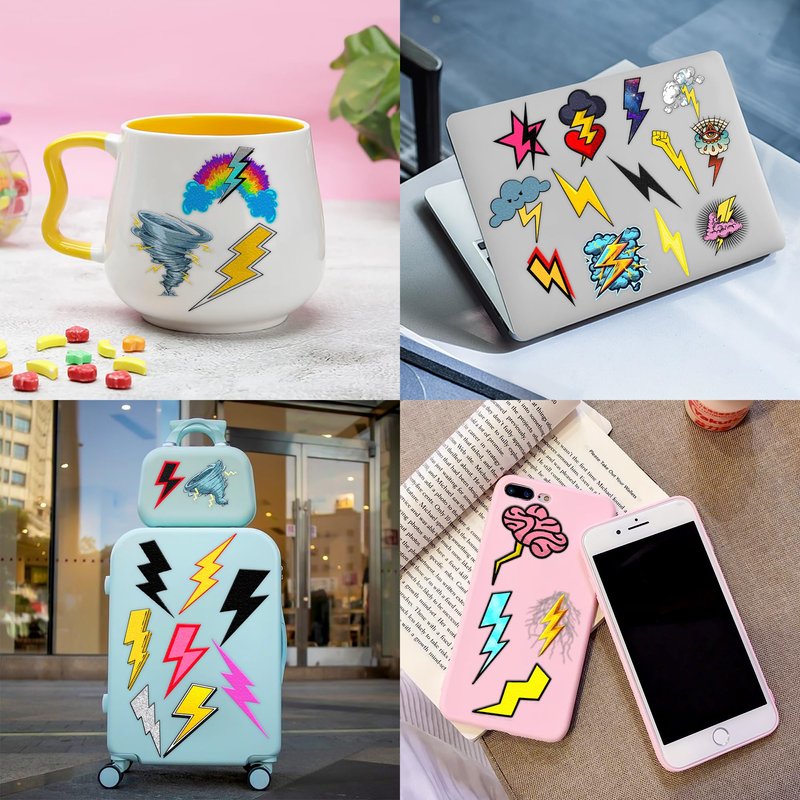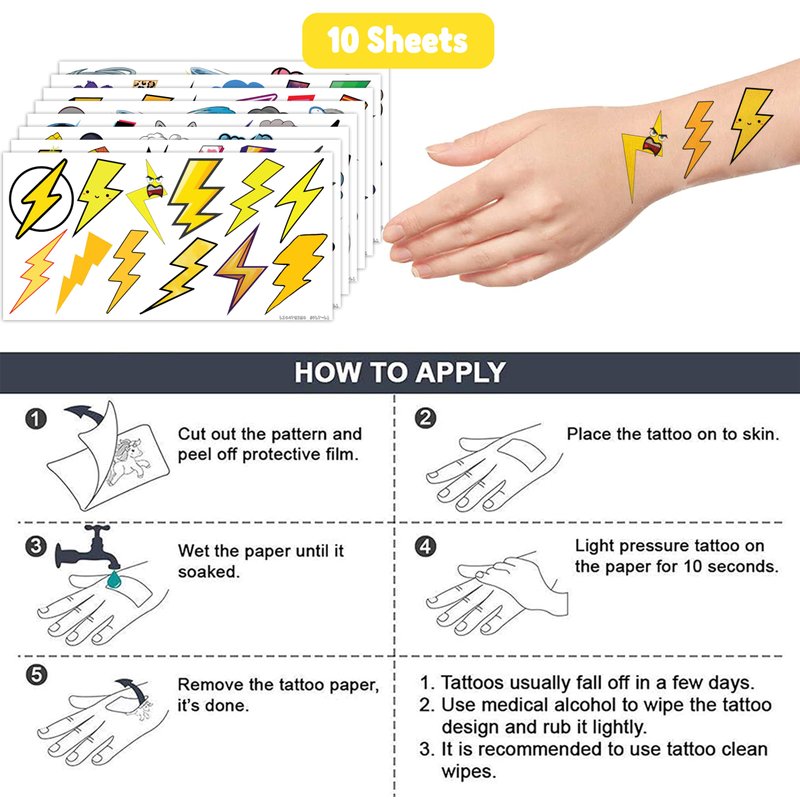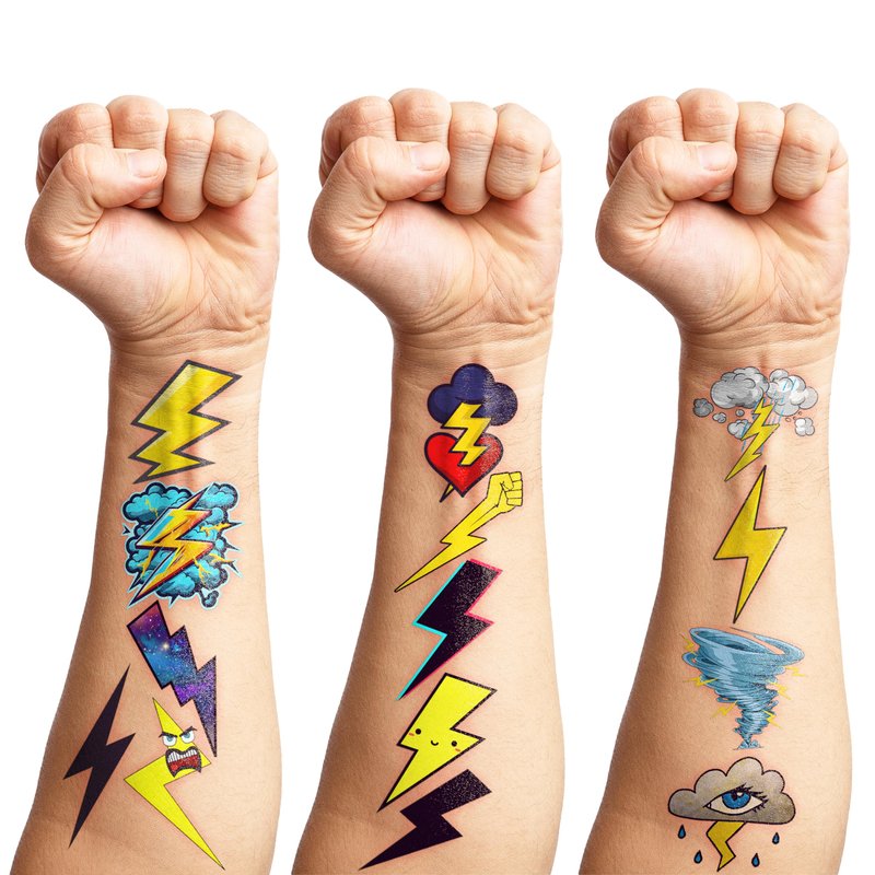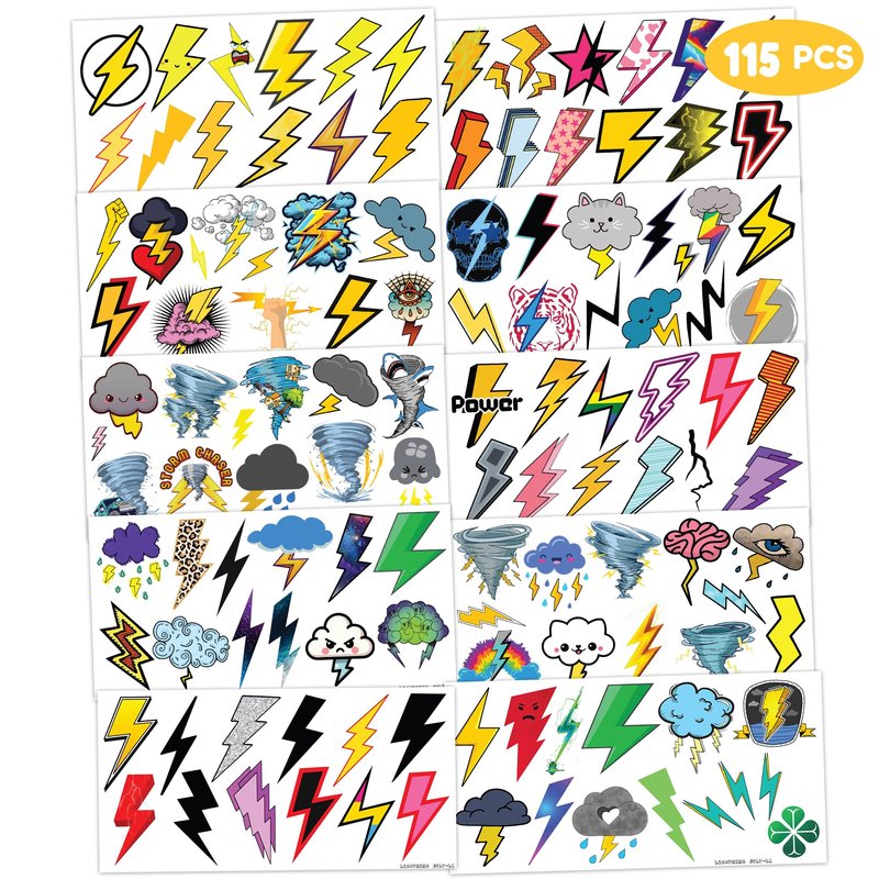 - ⚡ PERFECT TATTOOS FOR LIGHTNING BOLT THEMED DECORATION: LIGHTNING BOLT for people who love strength, likes to explore natural phenomena: lightning bolt, tornado… Featuring 10 sheets with 115 pcs of lovely, fun and colorful design. Each sheet measures 6.1 * 3.1 inches. You can temporarily tattoo them on your body or objects such as phones, bottles, laptop…