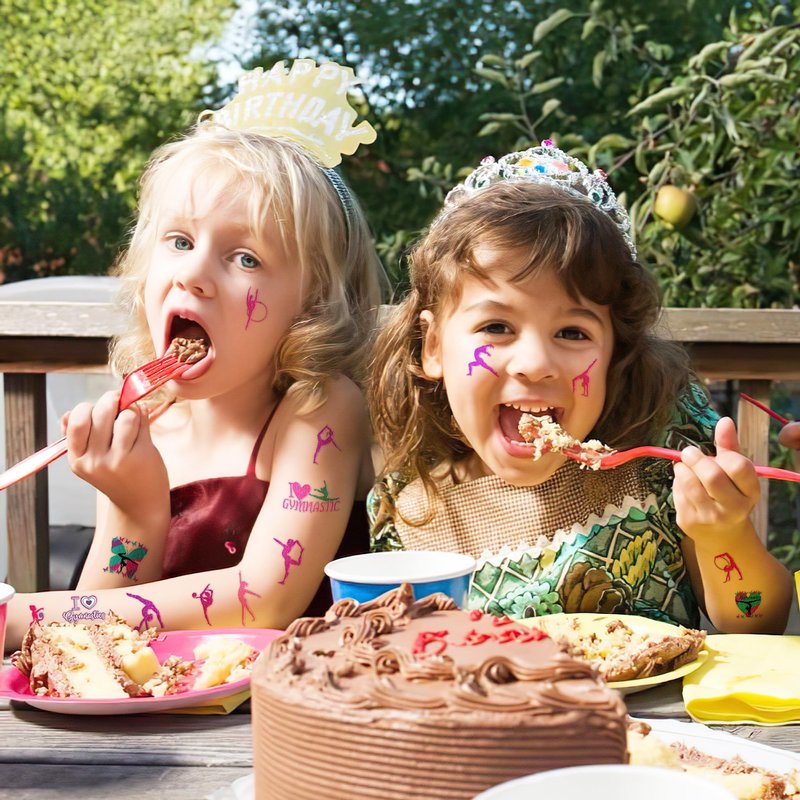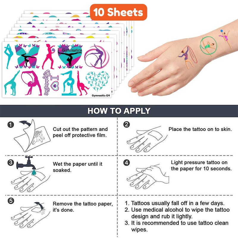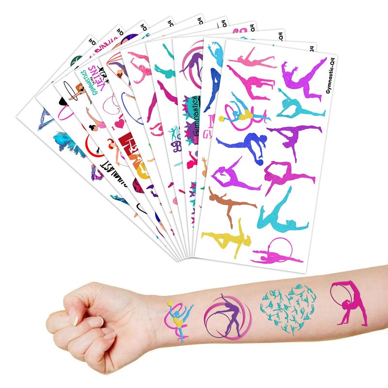 - The Perfect Gymnastics Gymnast Gymnastic Dance Cheerleader Theme Party Gift: 10 Sheets Gymnastics Gymnast Gymnastic Dance tattoos stickers, each sheet measures 6.1 * 3.1 inch , one size fit all adult and kids. One of the most popular party themes for children, make the best party gifts for your children & Carnival gifts, help your children become small heroes at the party! Bring nonstop joy to the whole party! Make your kids receive full of expectation and exploration in every festival.