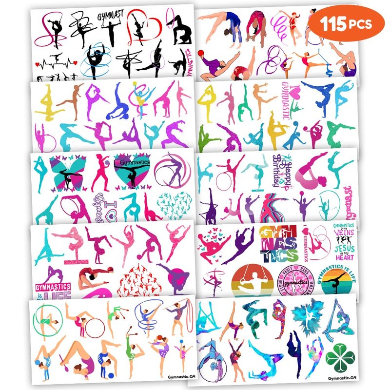 115 PCS Gymnastics Gymnast Gymnastic Temporary Tattoos Birthday Themed Party Decorations Favors Supplies Decor Cute Dance Cheerleader Stickers Gifts for Kids Boys Girls Carnival Christmas Class Prizes