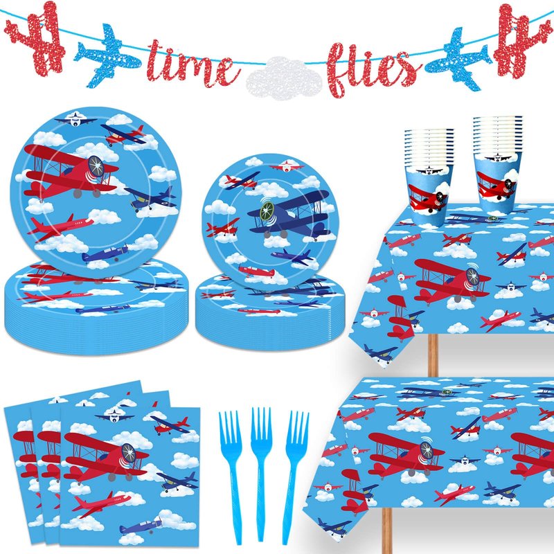 116 Pcs Airplane Birthday Party Decor Time Flies Paper Plates Napkins Forks Cups Tablecloth Banner Dinnerware for Aviation Theme Boys Baby Shower 1st 2nd 3rd 4th Bday Party Supplies Decorations